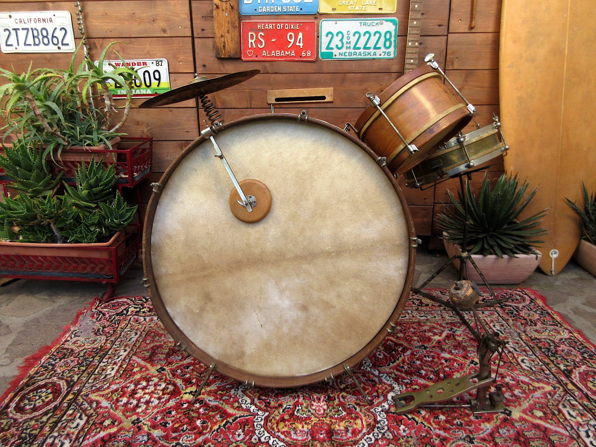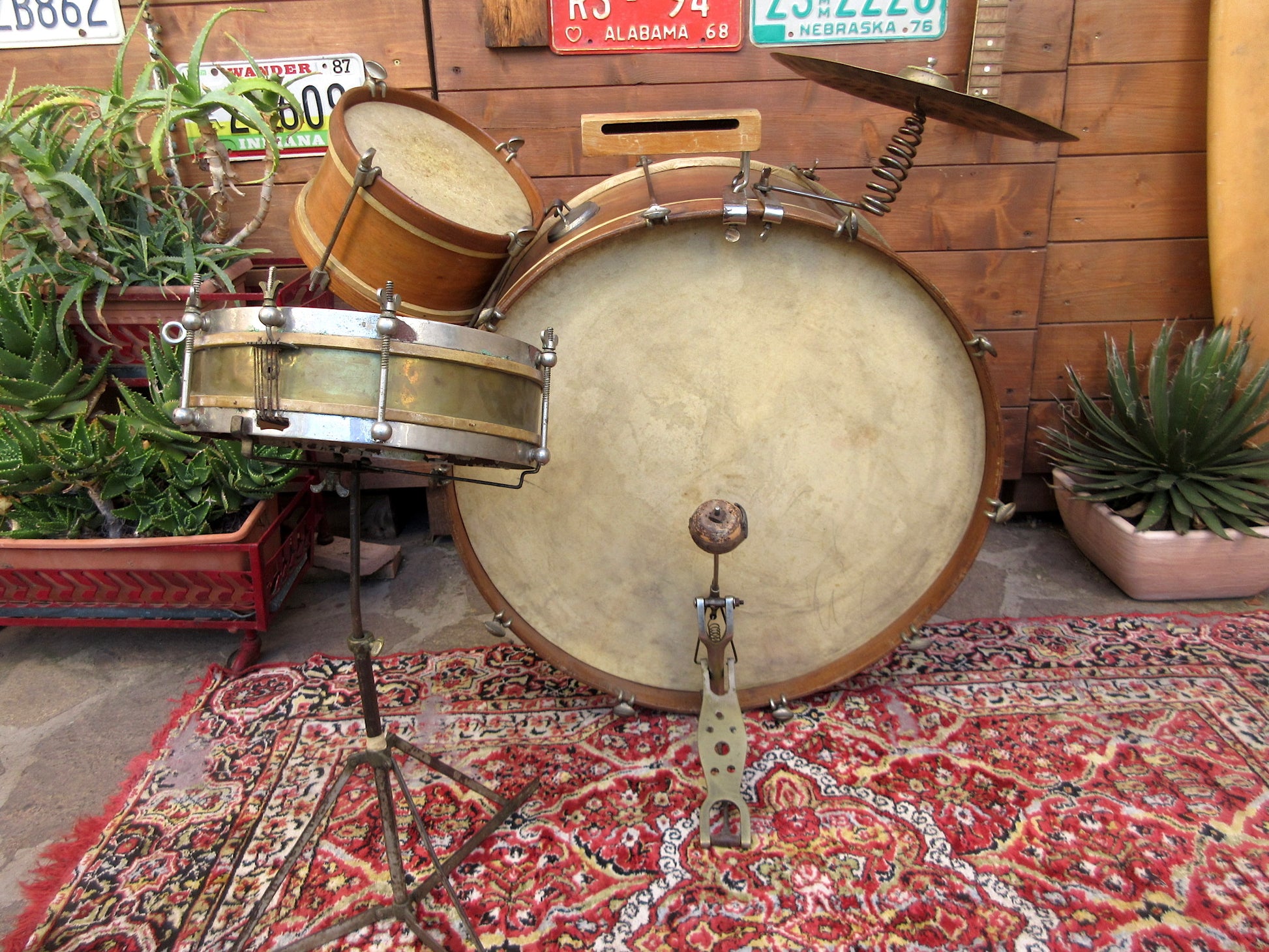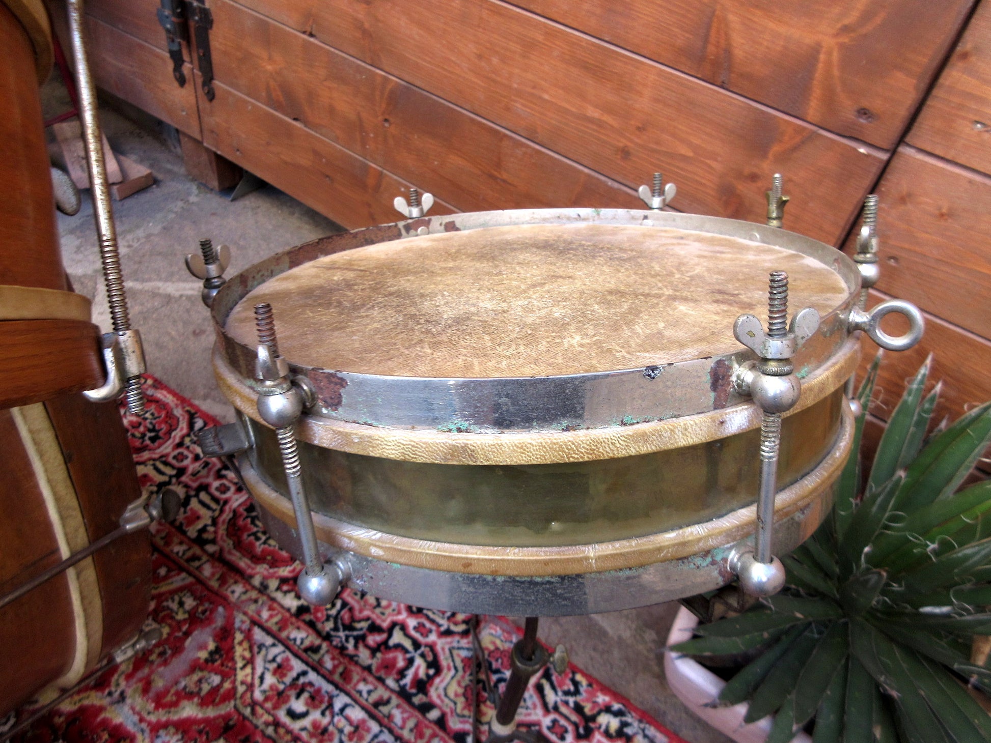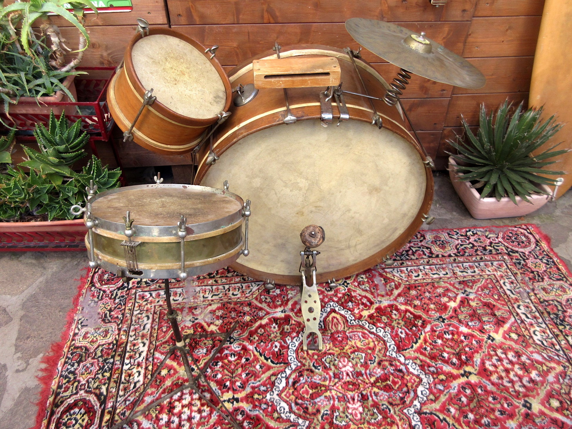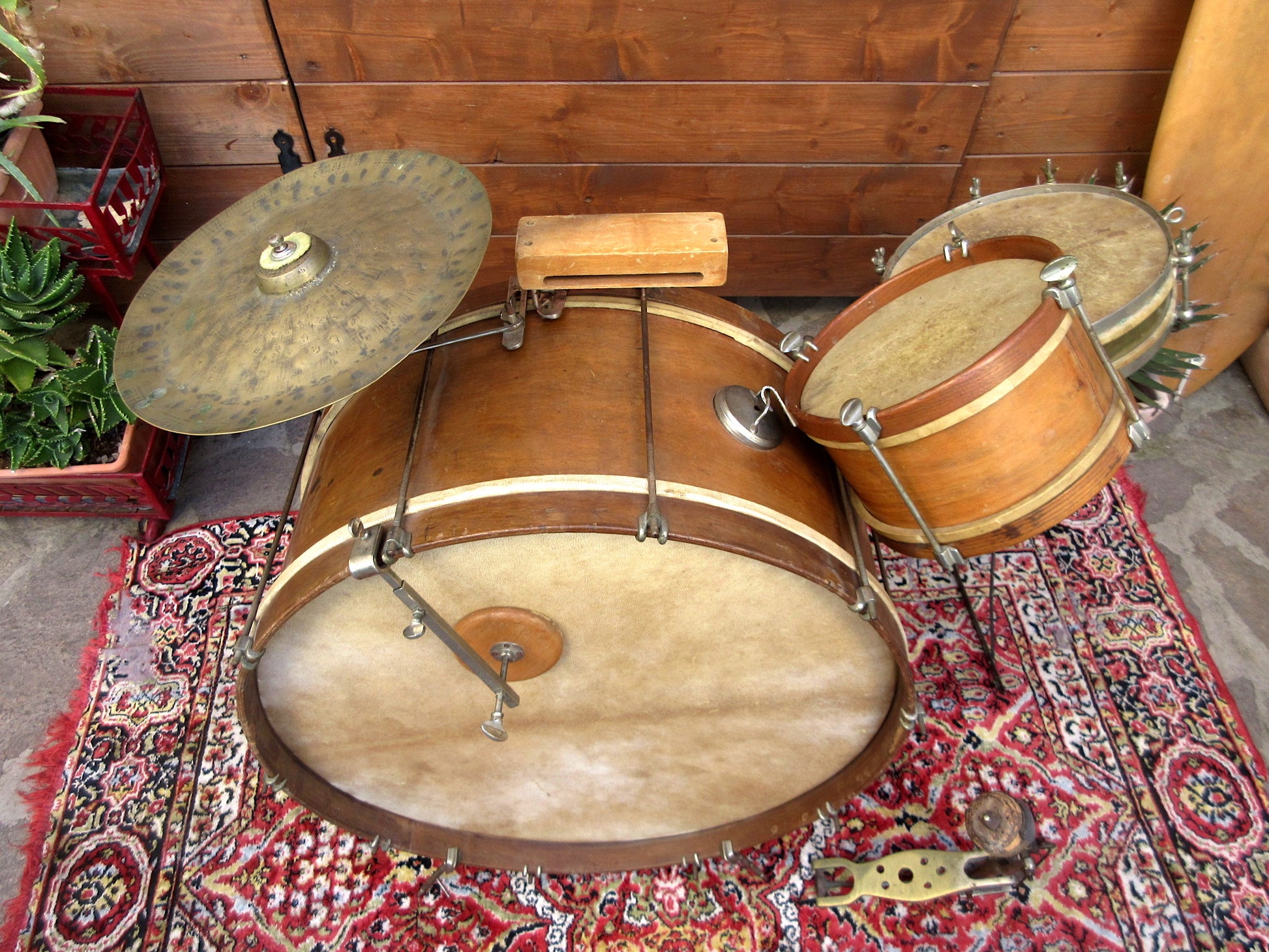 Questa stupenda batteria risale ai prim anni '20, è di marca ignota e produzione probabilmente europea, ed è composta da una cassa di circa 25”x10”, un piccolo tom 9,5”x5”, un rullante 12”x3” in ottone, un piatto cinese da 12”, un woodblock, un bellissimo pedale per la cassa e un supporto per il rullante.