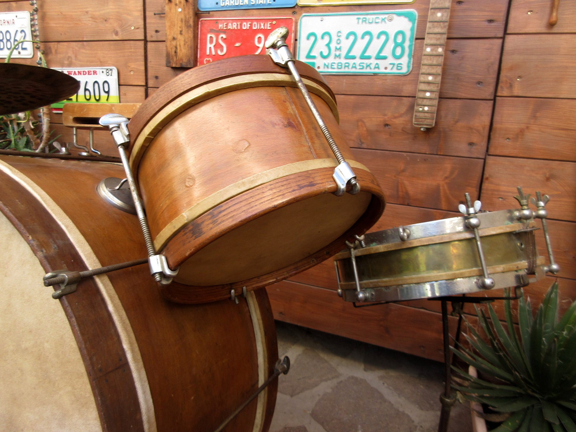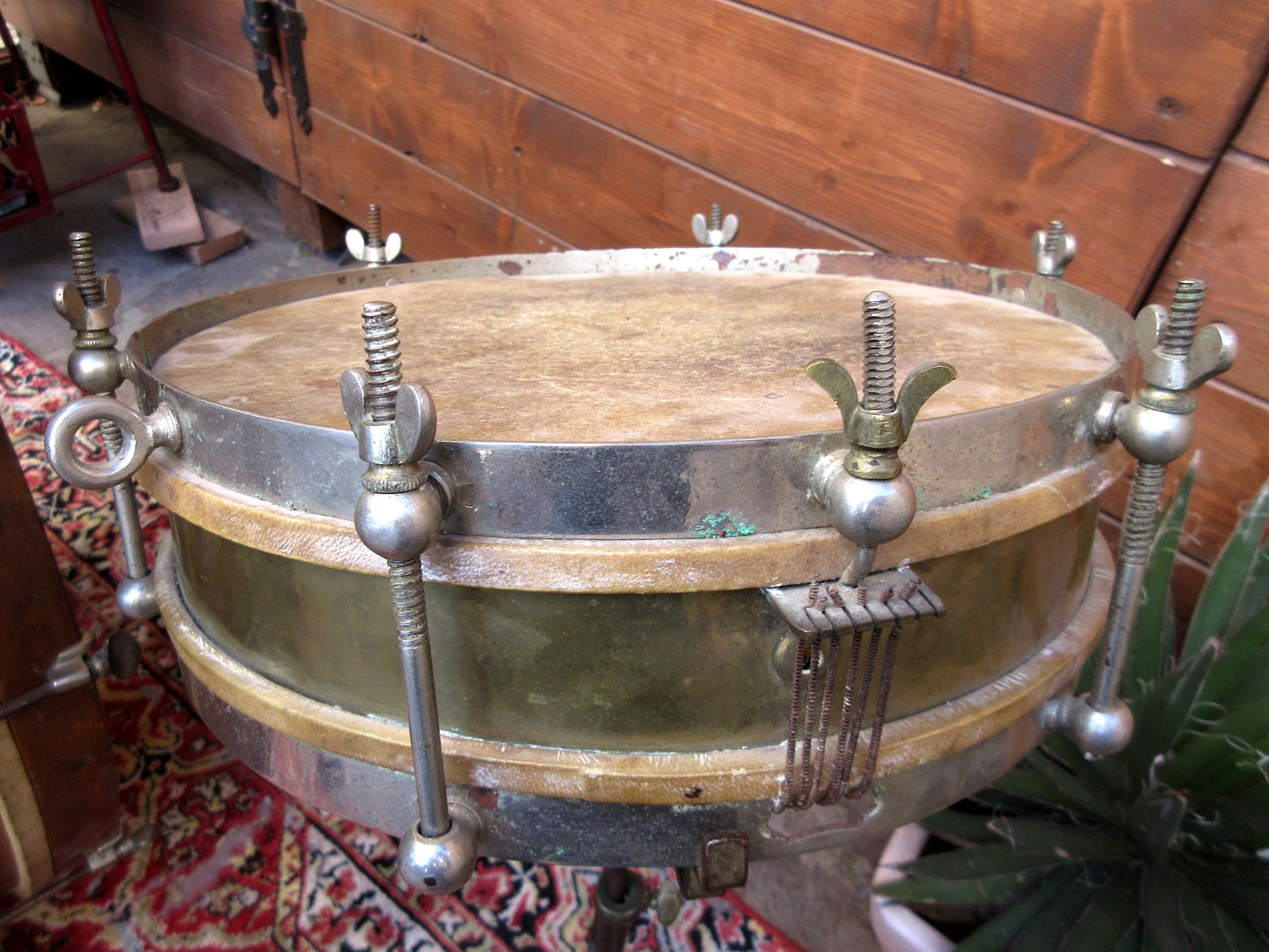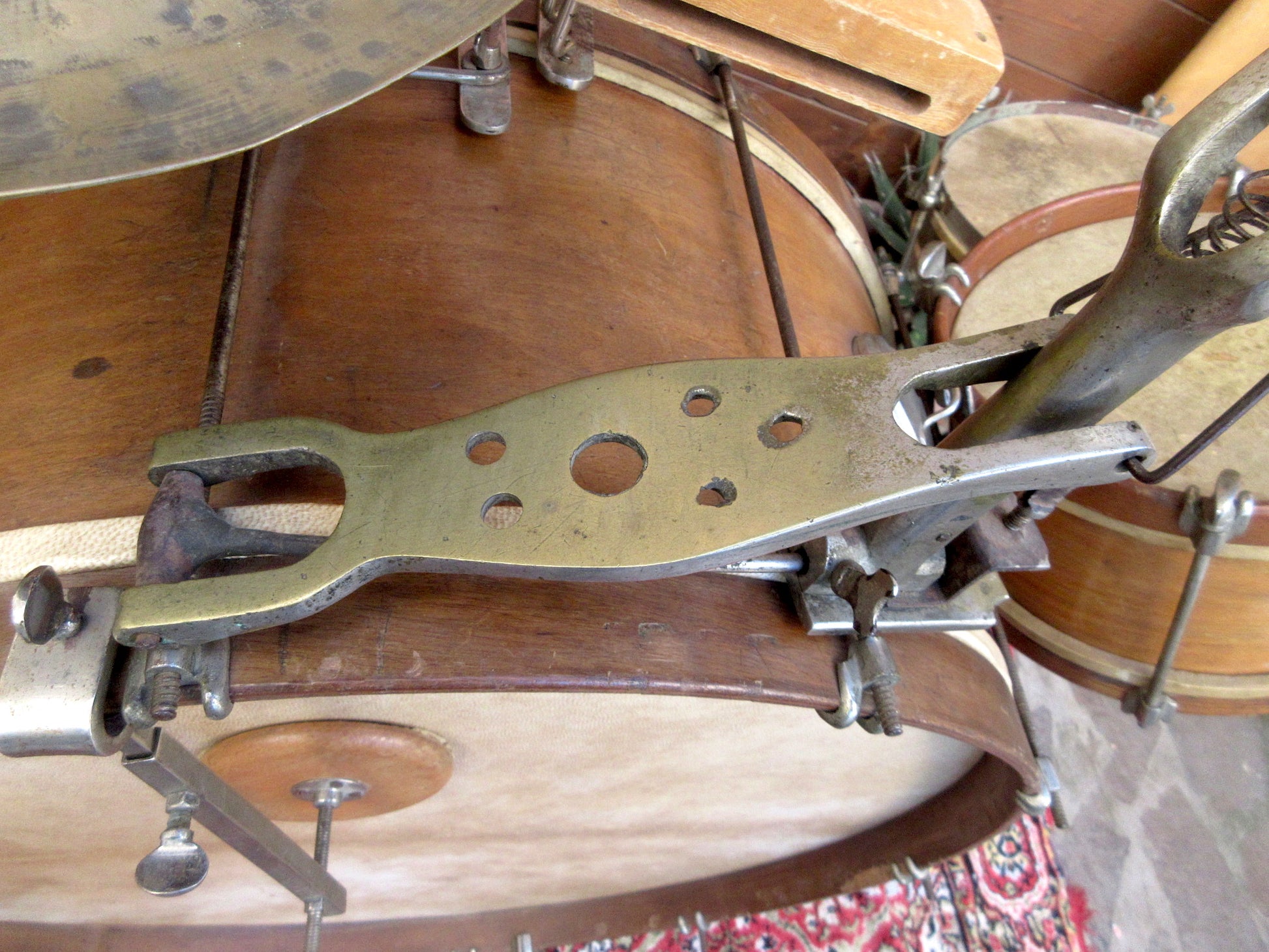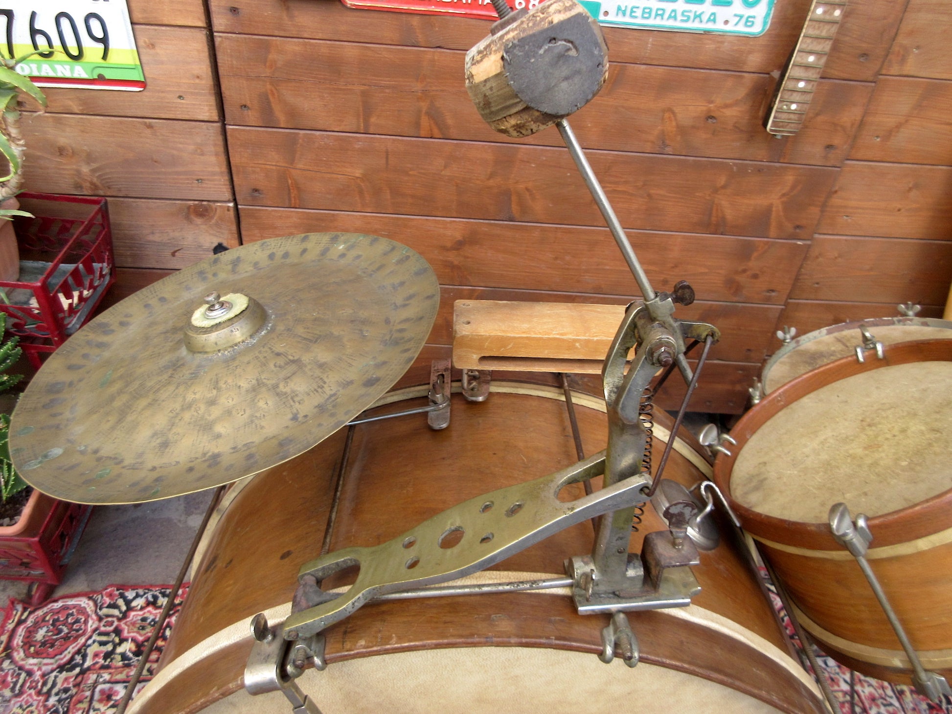 Questa stupenda batteria risale ai prim anni '20, è di marca ignota e produzione probabilmente europea, ed è composta da una cassa di circa 25”x10”, un piccolo tom 9,5”x5”, un rullante 12”x3” in ottone, un piatto cinese da 12”, un woodblock, un bellissimo pedale per la cassa e un supporto per il rullante.