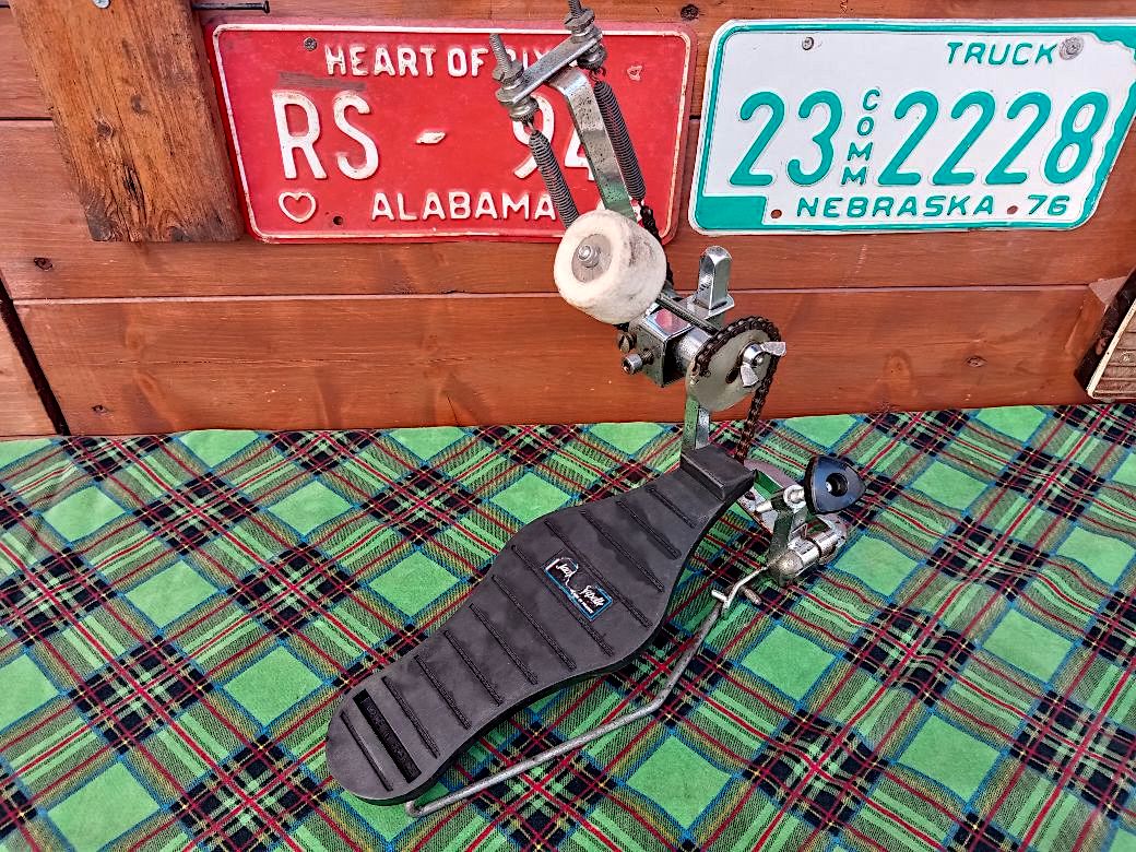 A historic bass drum pedal, a classic of French production from the 70s. In good condition and fully functional.