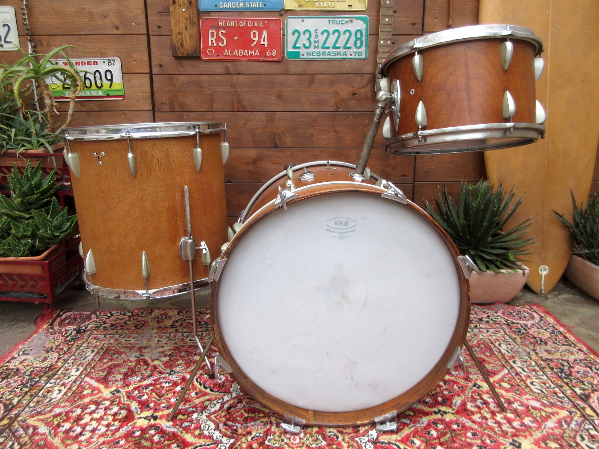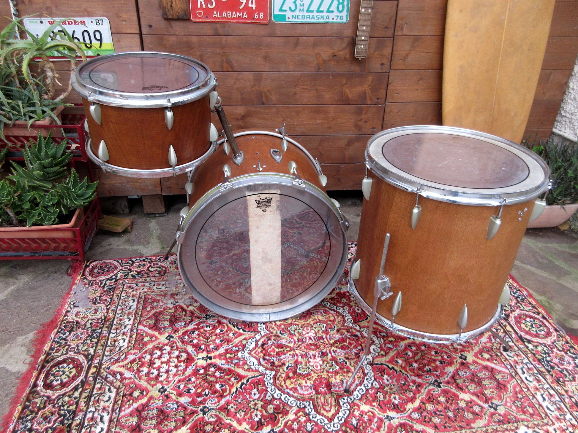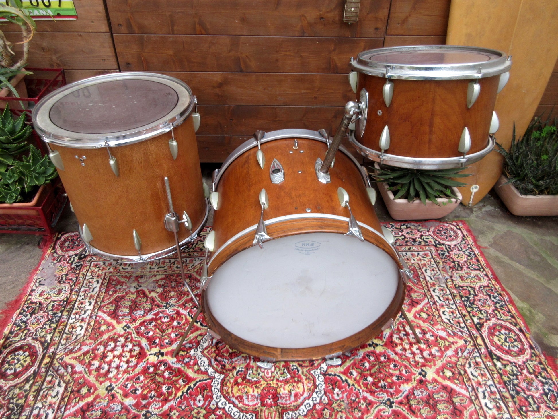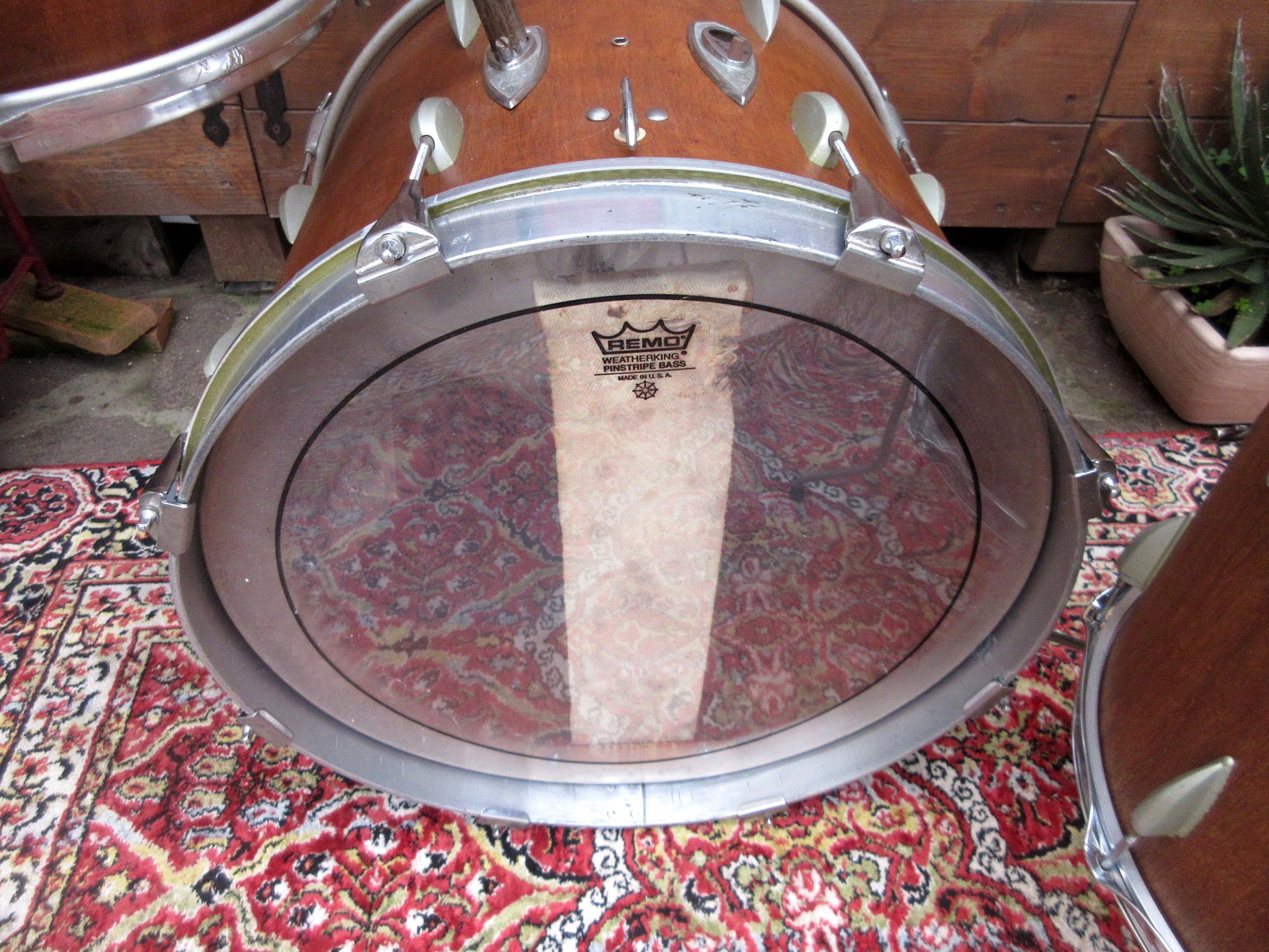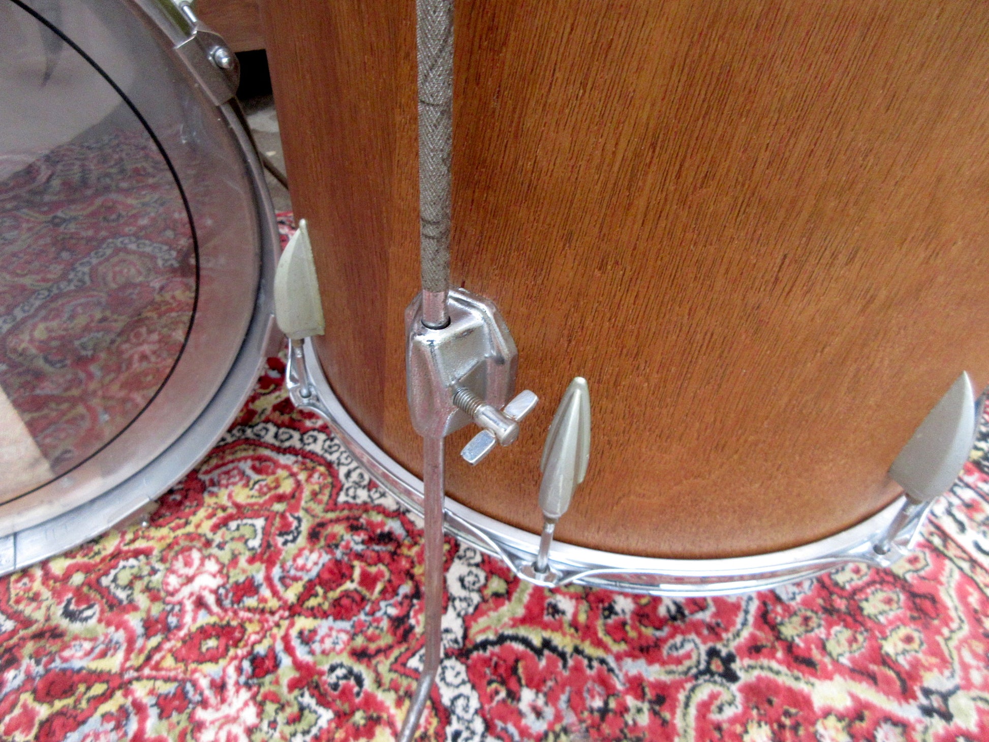 The bass drum has an original rim but without inlay and a metal one, and eight generic screws and claws replace the original ones that were lost. There is an adjustable internal muffler. 13" tom has the original rims but the mufflers have left only the relative sad holes as an everlasting memory. The 16" floor tom has generic triple flange rims and three legs brackets which do not appear to be the original ones, at least judging from the catalogues.