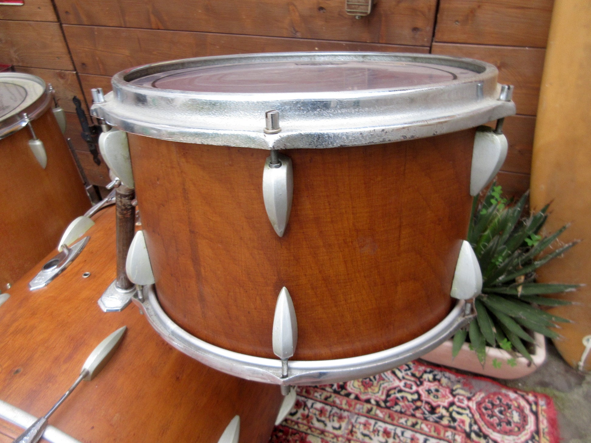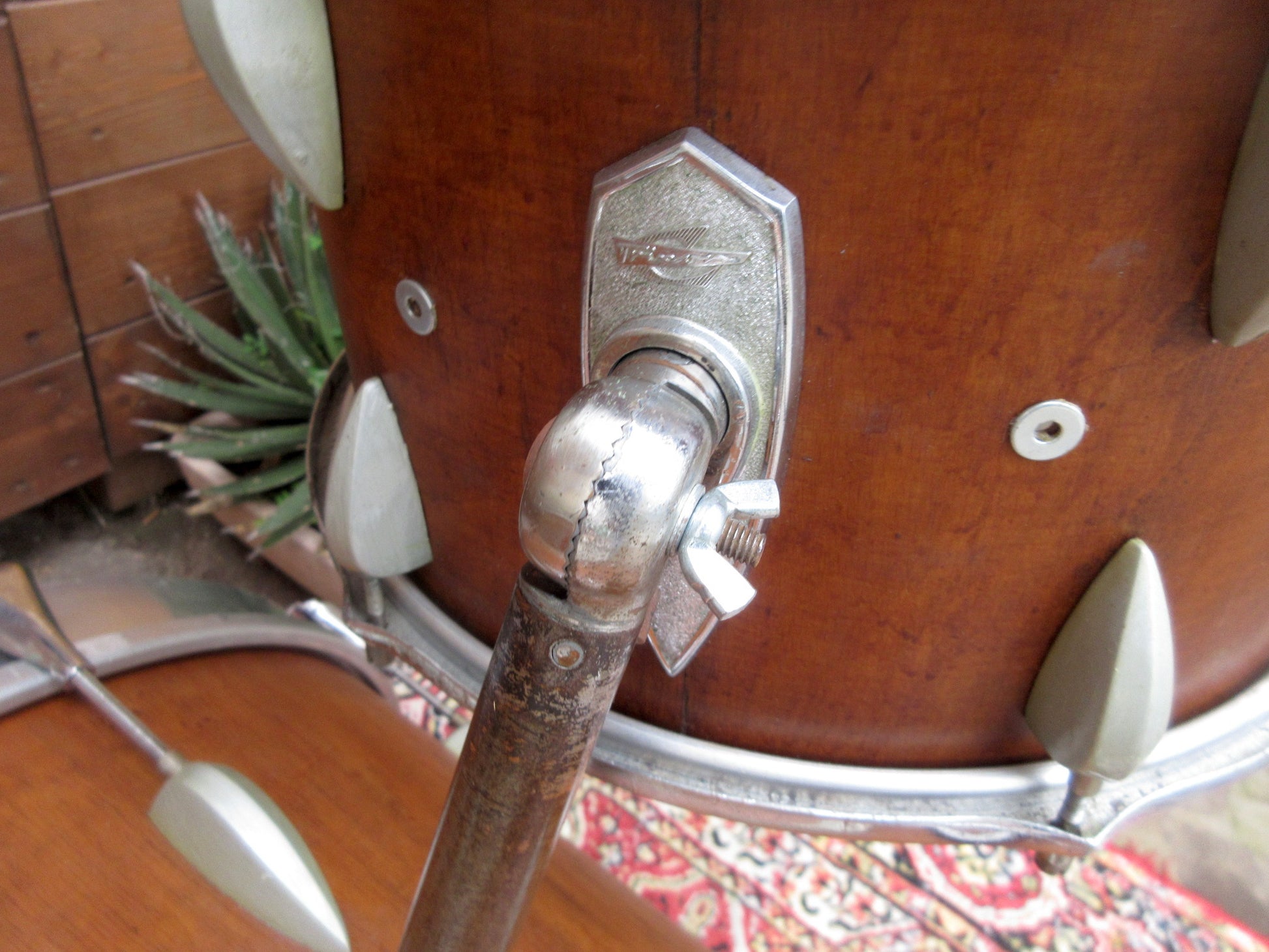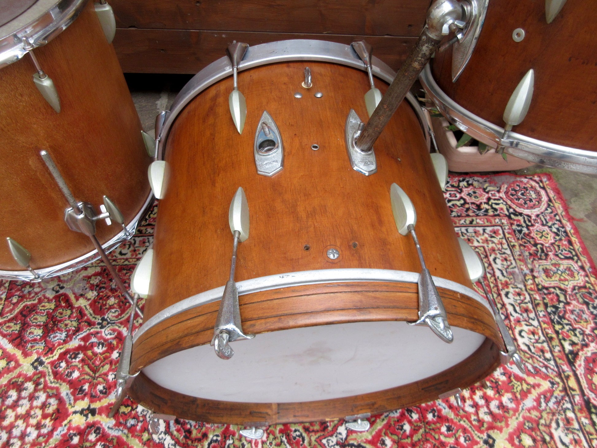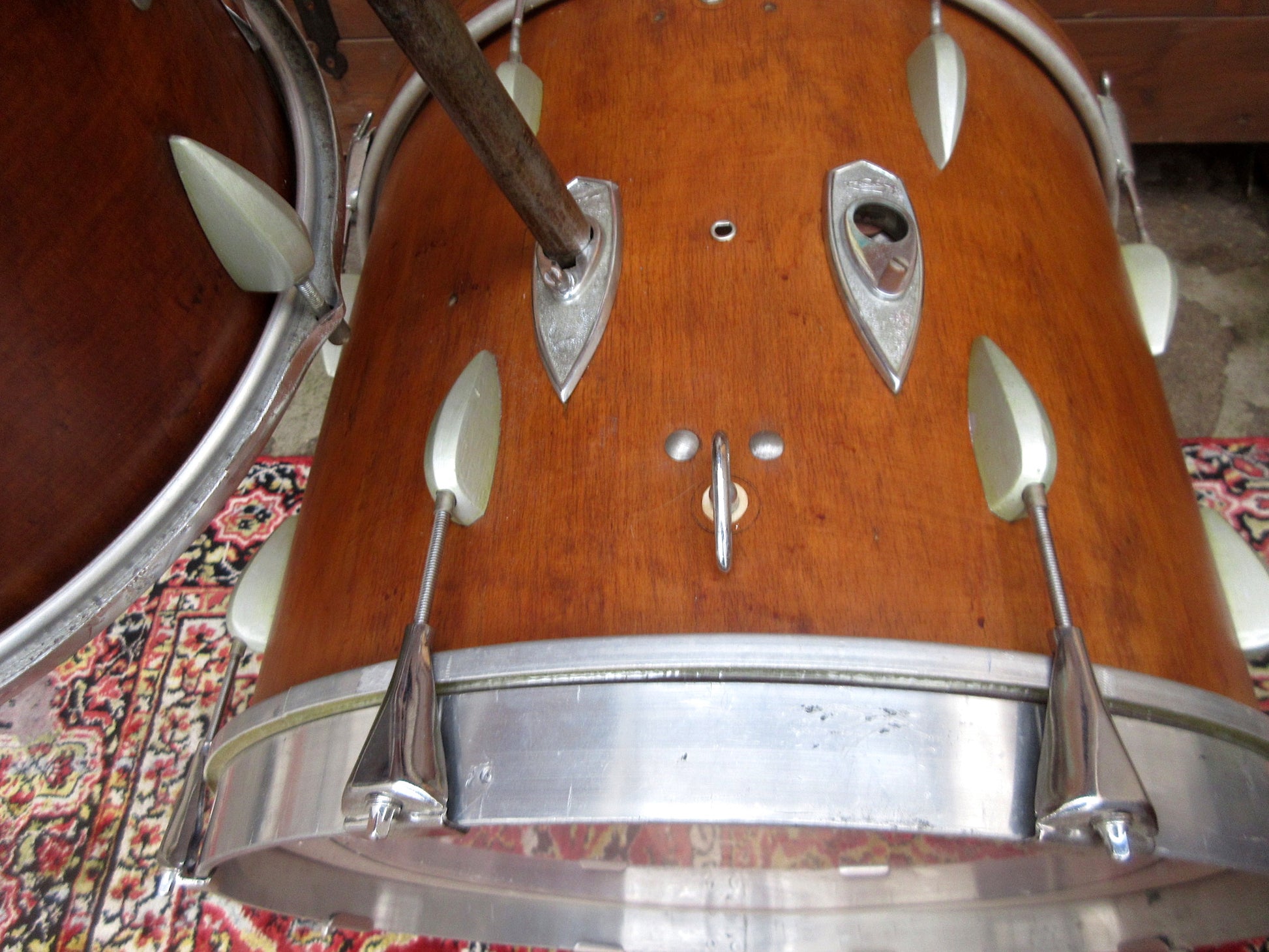 It must have been through a lot, because the original wrap was removed, the shells were left quite natural, and all the badges ended up who knows where. The lugs are those produced by Trixon from 1956 to 1963.