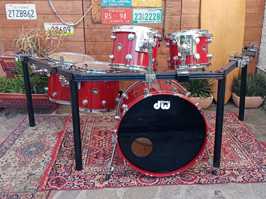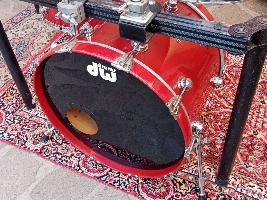 I fusti sono Keller, abbastanza spessi e dotati di bordi di rinforzo. All'interno non troviamo nè data di produzione, nè il numero di serie, nè la nota di risonanza. Probabilmente si tratta di una primissima produzione DW, testimoniata anche dal vecchio badge nero su cui i numeri di serie sono pressochè sequenziali. La finitura laccata è la bellissima "Candy Apple Red Solid", disponibile solo su richiesta. La cassa non è forata, tutti gli altri tamburi sono dotati del sistema di supporto R.I.M.S. con il blocchetto reggitom Pearl. La cassa, senza alcuna sordina, suona grossa, piena, definita, ha un ottimo punch ed un gran volume molto bilanciato con il resto dei tamburi. Ottimi i 4 tom, dal timbro profondo, risonante e con un attacco molto definito. Forse è vero che la vecchia produzione DW era migliore di quella attuale.