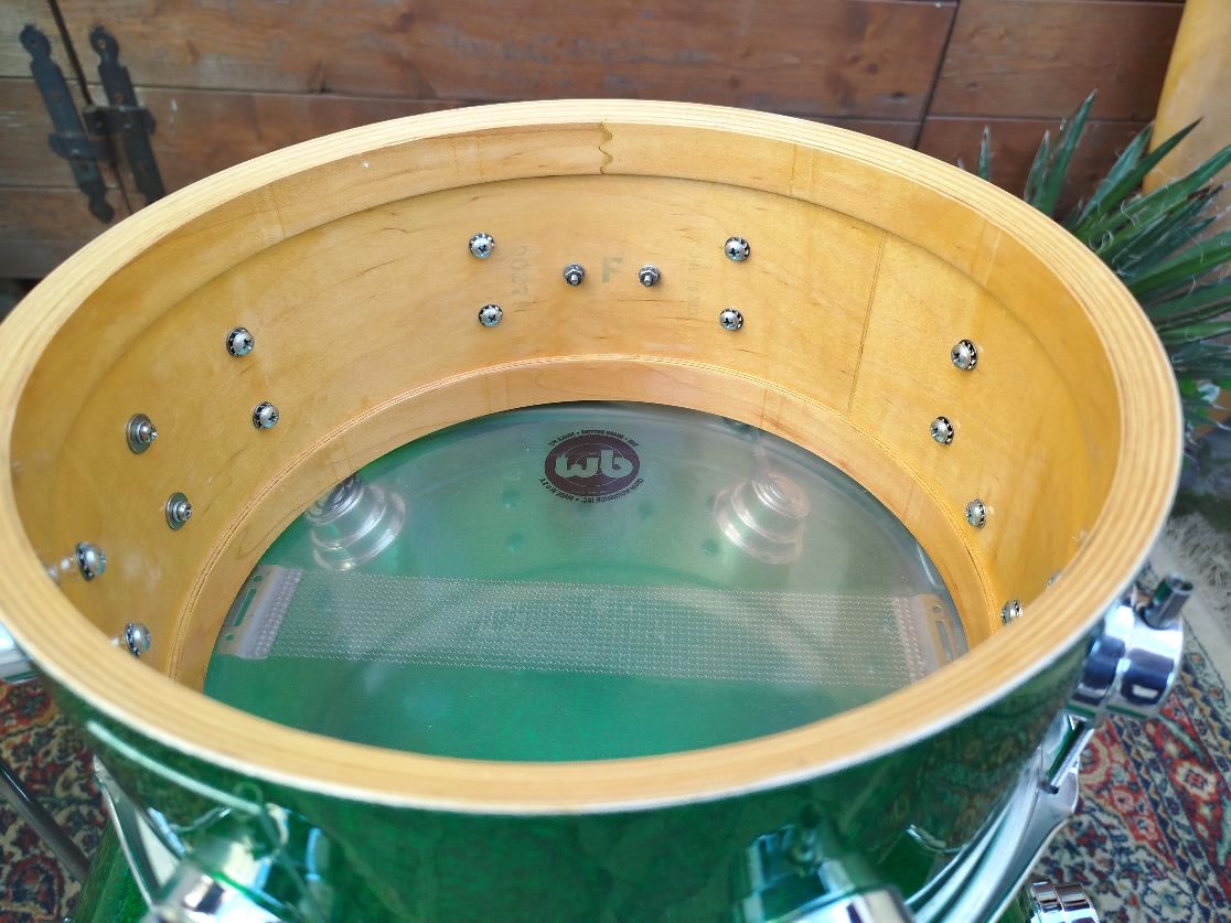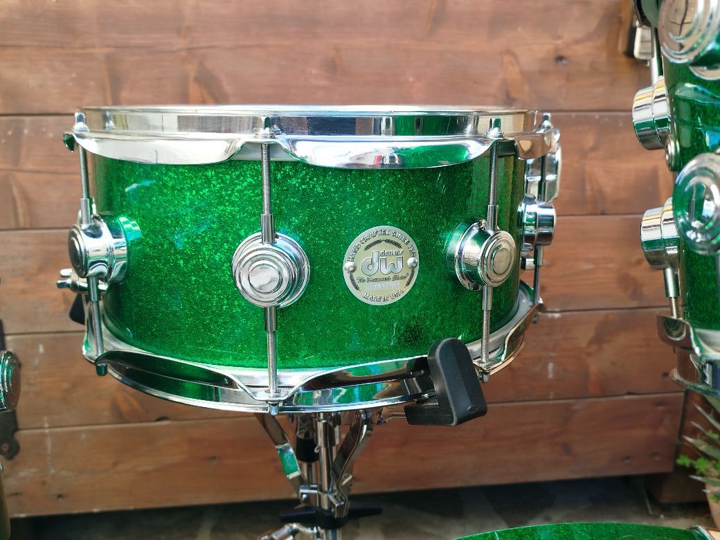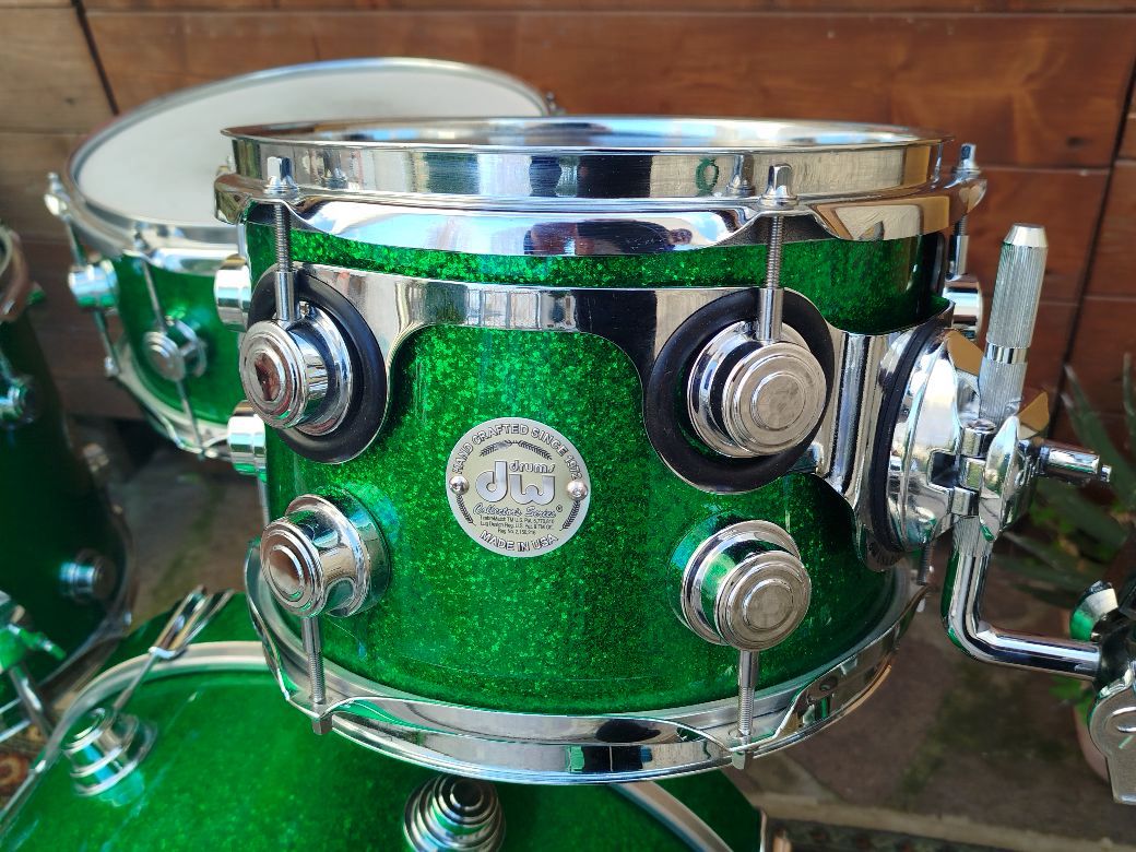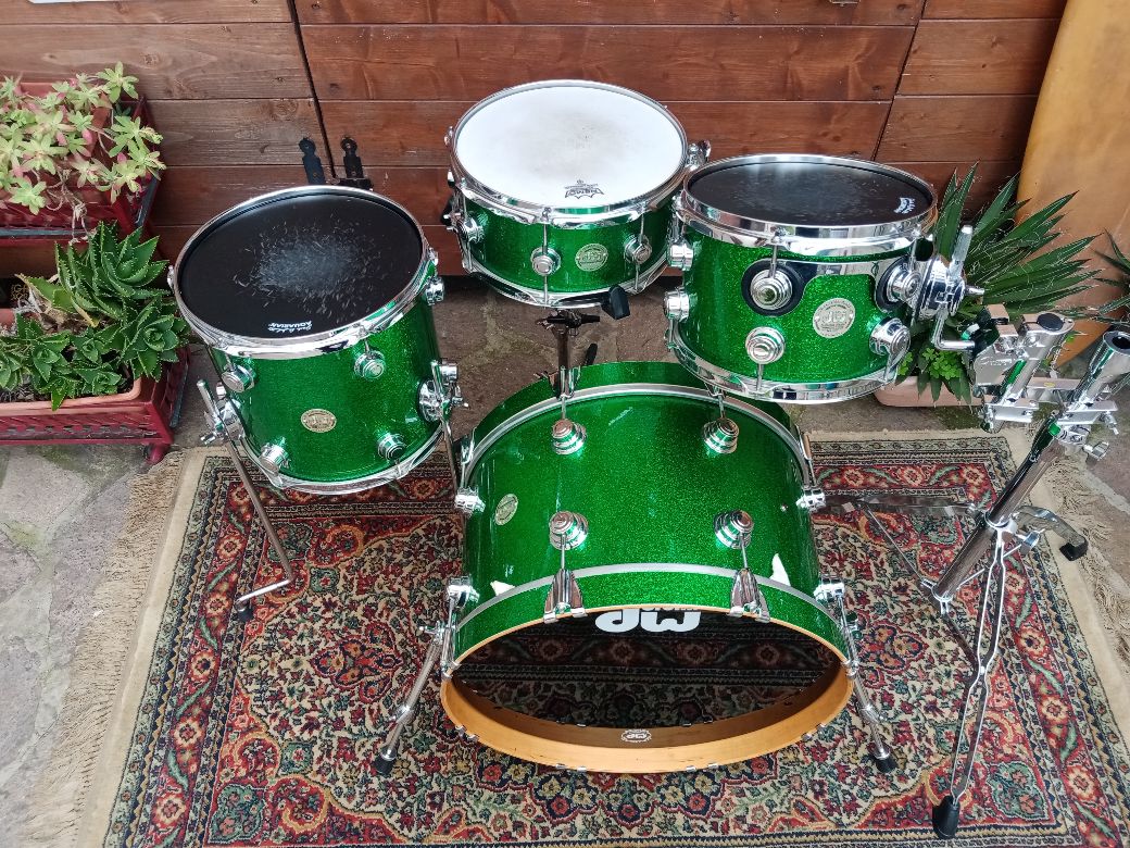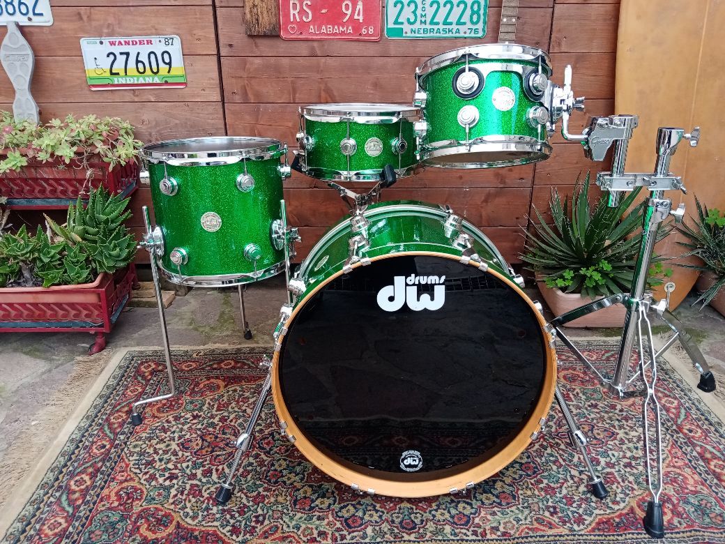 Una batteria deliziosa, usata ma in condizioni eccellenti. 20"x12" (Jul 1 2002, nota C#), 10"x7" (Jul 18 2003, nota B)", 12"x11" Jul 18 2003 nota F#), rullante 12"x6" (Jul 18 2003 nota F), finitura ricoperta Green Sparkle.