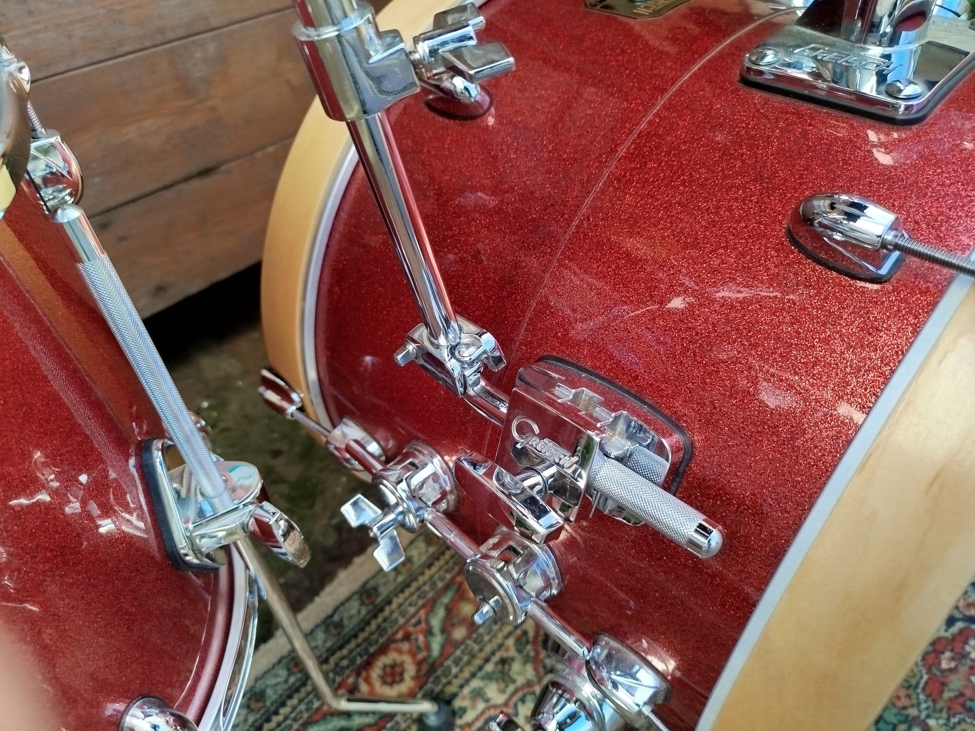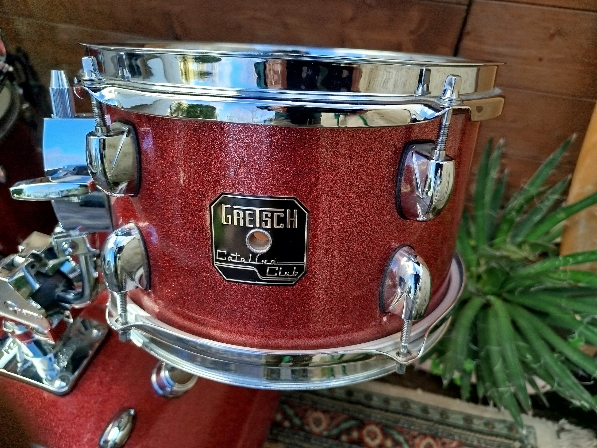 La Gretsch Catalina è una delle serie di maggior successo sul mercato per il rapporto qualità prezzo davvero notevole; fusti in mogano, bordi a 30°, cerchi di rullante, tom e timpano di spessore 1,6mm., hardware all'altezza delle aspettative. Anche la cassa aveva in dotazione cerchi in metallo, ma è stata successivamente equipaggiata con una coppia di cerchi in acero; una scelta a mio avviso ben ponderata.