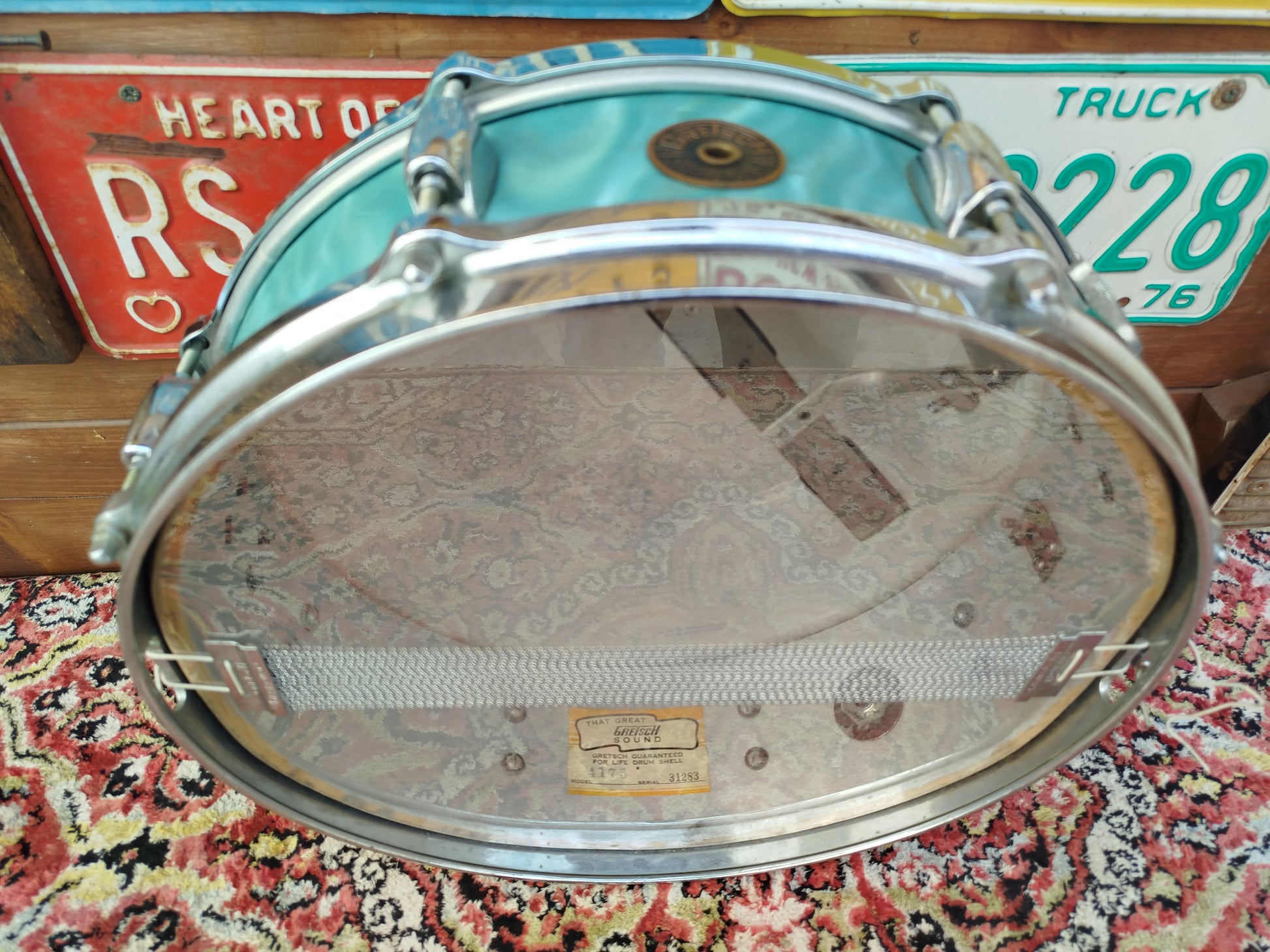 Rullante "roundbadge" esageratamente bello e piuttosto raro, completamente originale ed in condizioni ottime. 14"x4", finitura ricoperta Aqua Satin Flame. Risale al 1964.