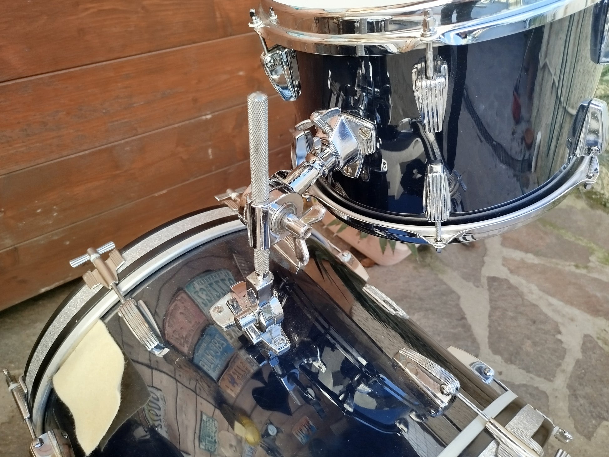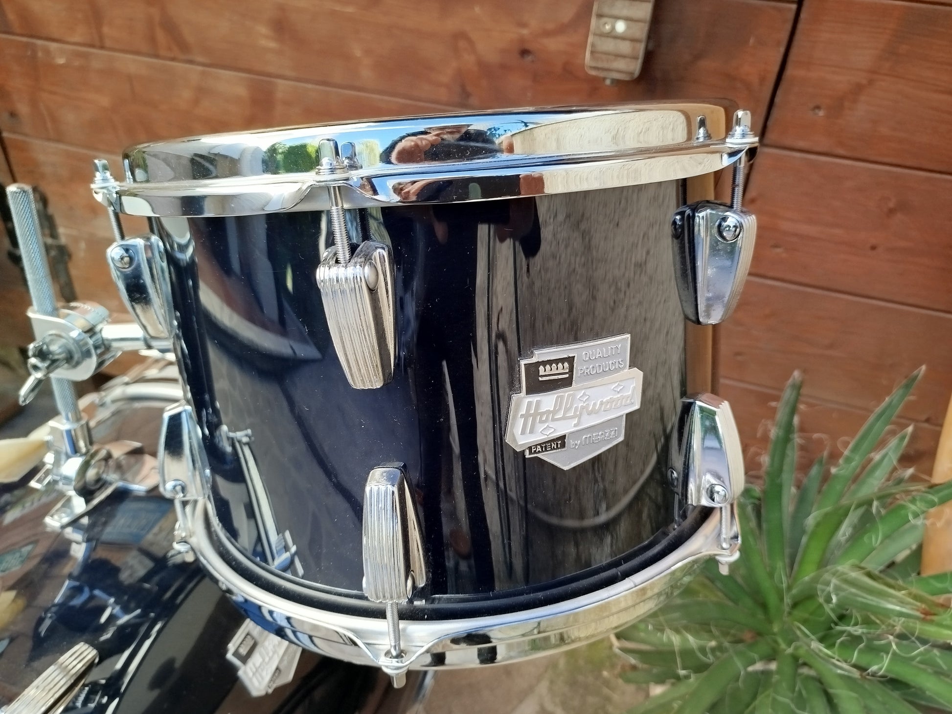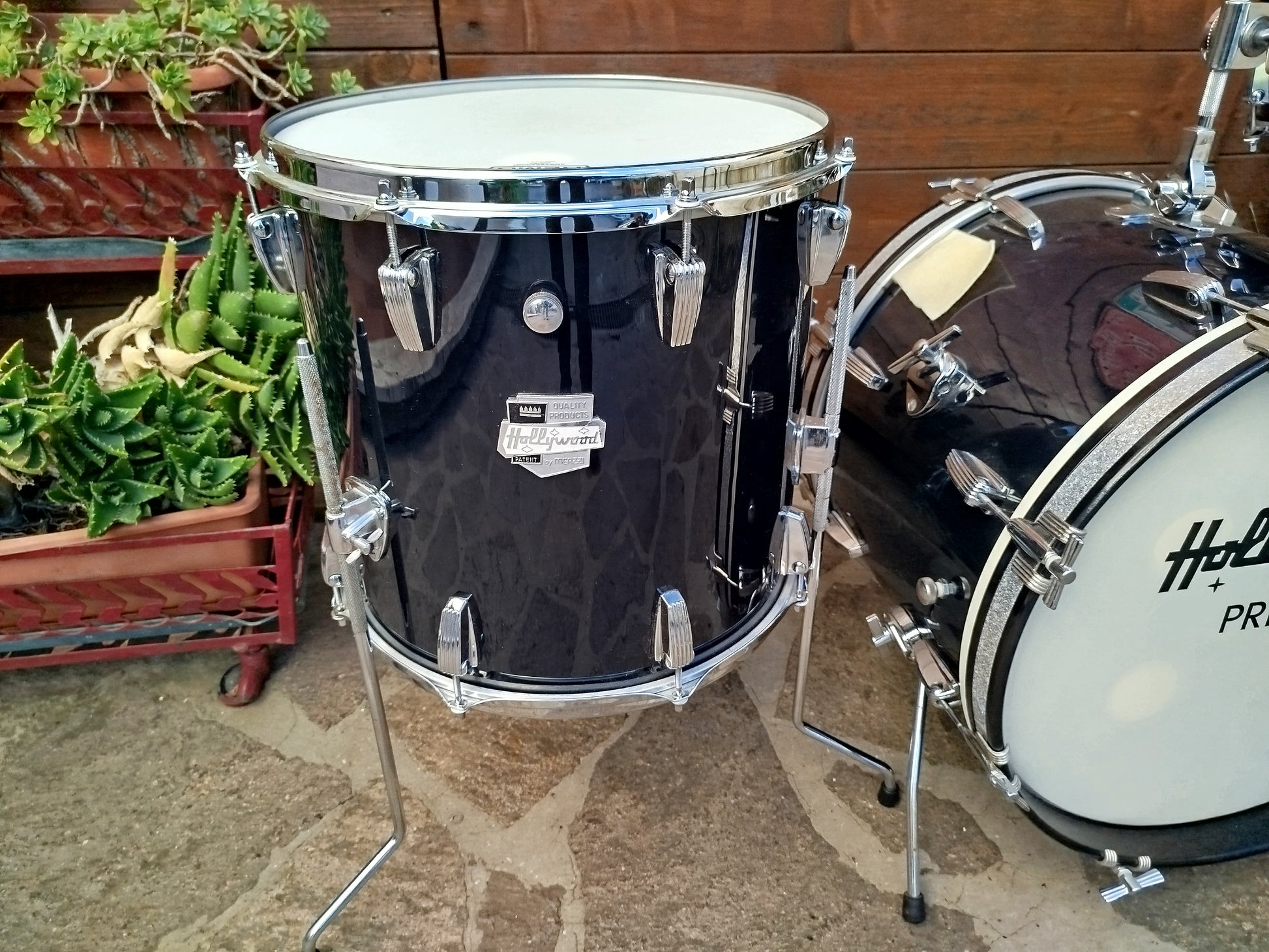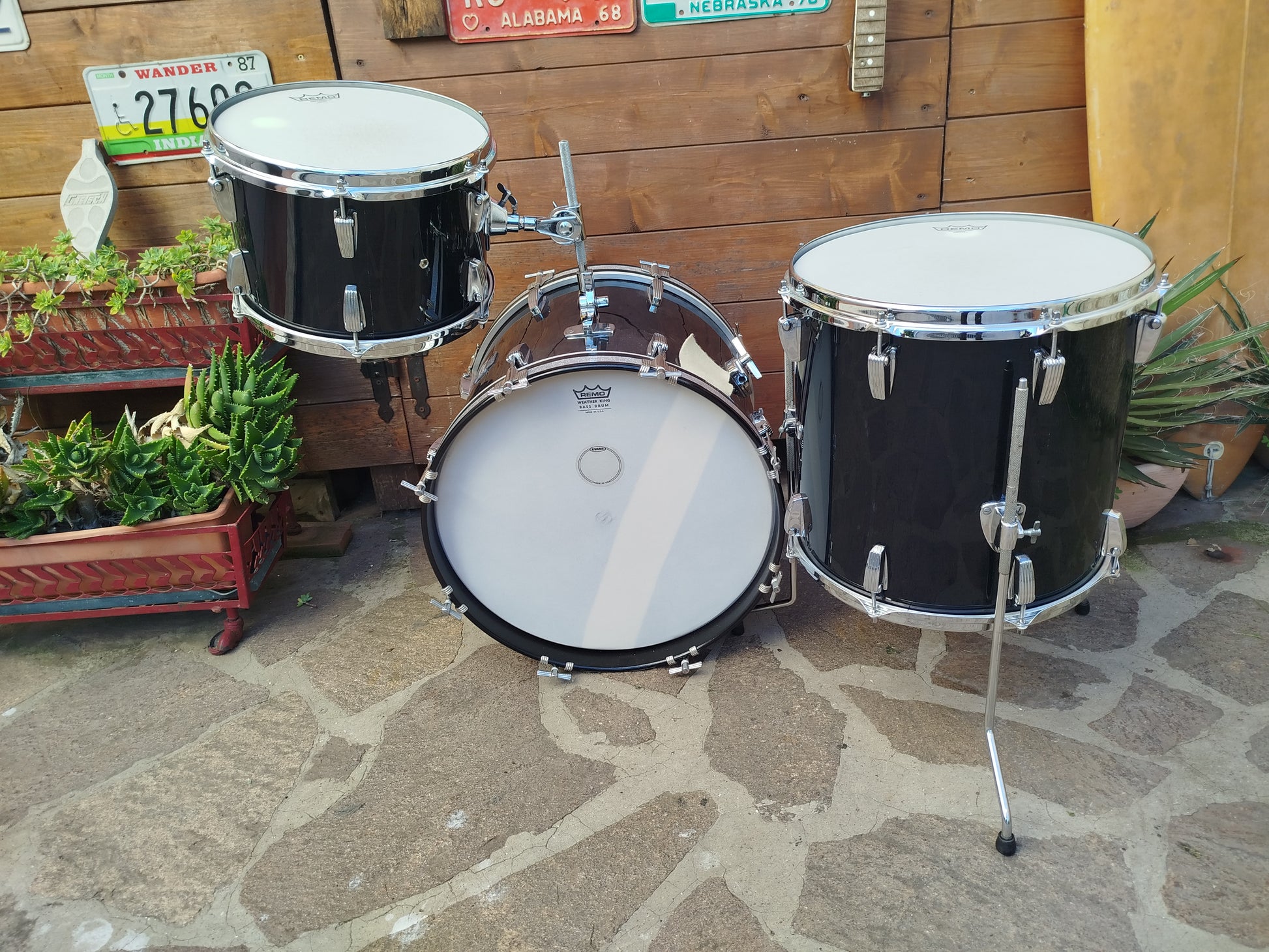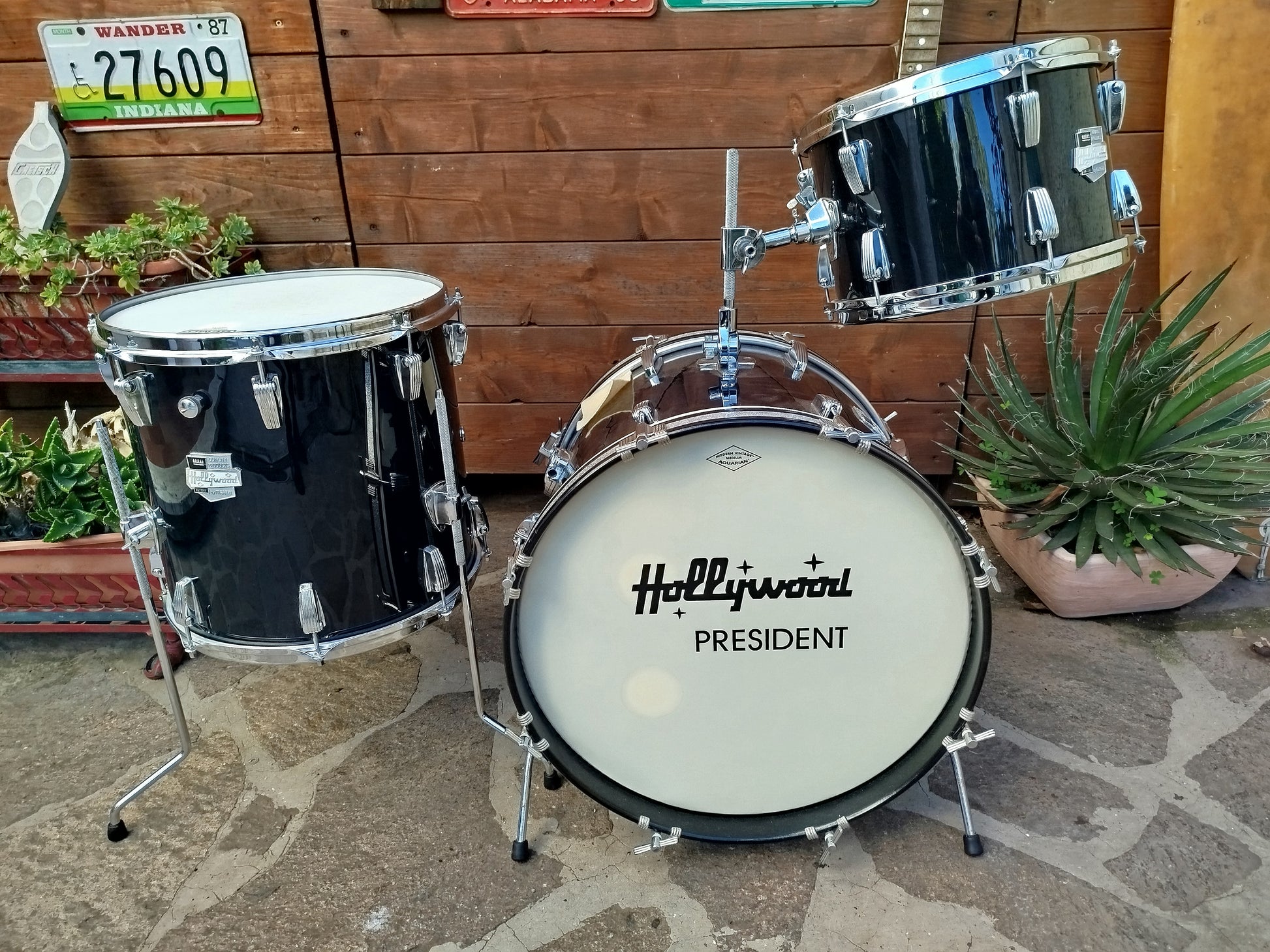 Questa Hollywood President, con misure 18"x14", 12"x8", 14"x14", è stata completamente ricondizionata rispettando le caratteristiche originali più essenziali. Fusti in faggio,. il 12" è stato realizzato su richiesta dalla ditta Villa, la stessa che costruiva i fusti per Meazzi durante gli anni '60 e '70, con le stesse identiche specifiche dell'epoca (spessore, forma dei bordi, eccetera. Il rivestimento è un Delmar Black, che non era presente nei cataloghi Meazzi dell'epoca, ma che fa una splendida figura su questo piccolo set, almeno a mio modesto parere.