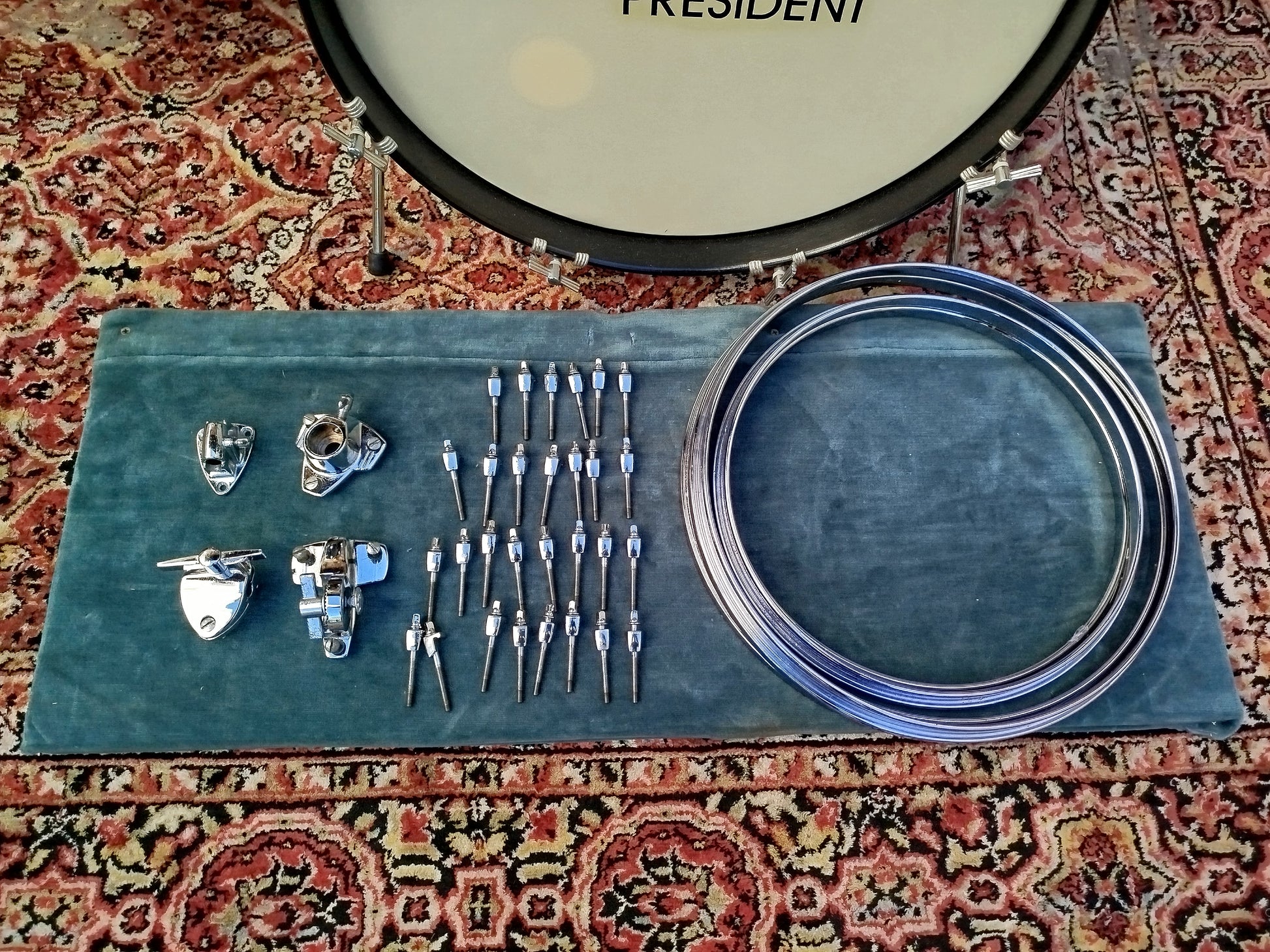 Sono stati montati cerchi a tripla flangia simili agli Slingerland Stick Saver, ma sono incluse nel set le due coppie di cerchi originali con le viti e le piccole graffe, in modo tale che i puristi possano avere la batteria nelle condizioni estetiche più vicine all'originale. Troviamo anche, sempre inclusi nel set, la base del blocco porta tom alla cassa, quello per l'asta piatto e per una zampa del timpano, oltre ad un blocchetto porta tom; il tutto in condizioni incredibili, sembrano appena usciti dalla fabbrica!