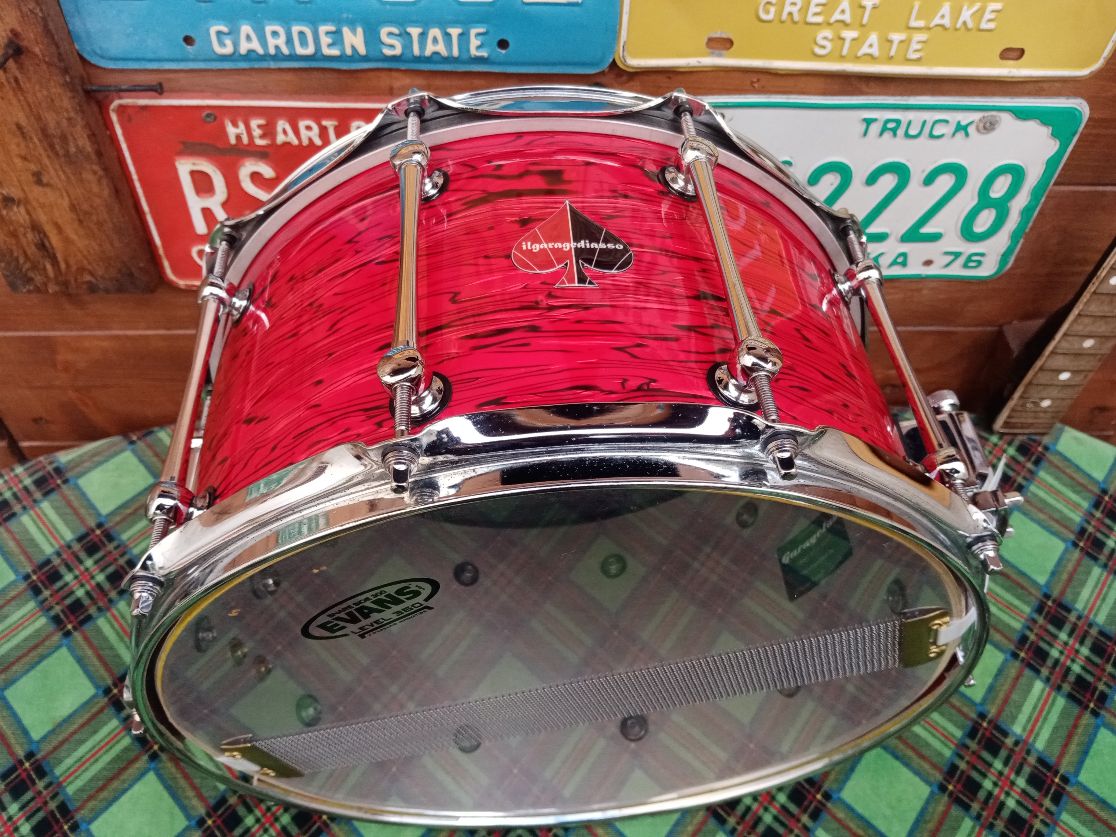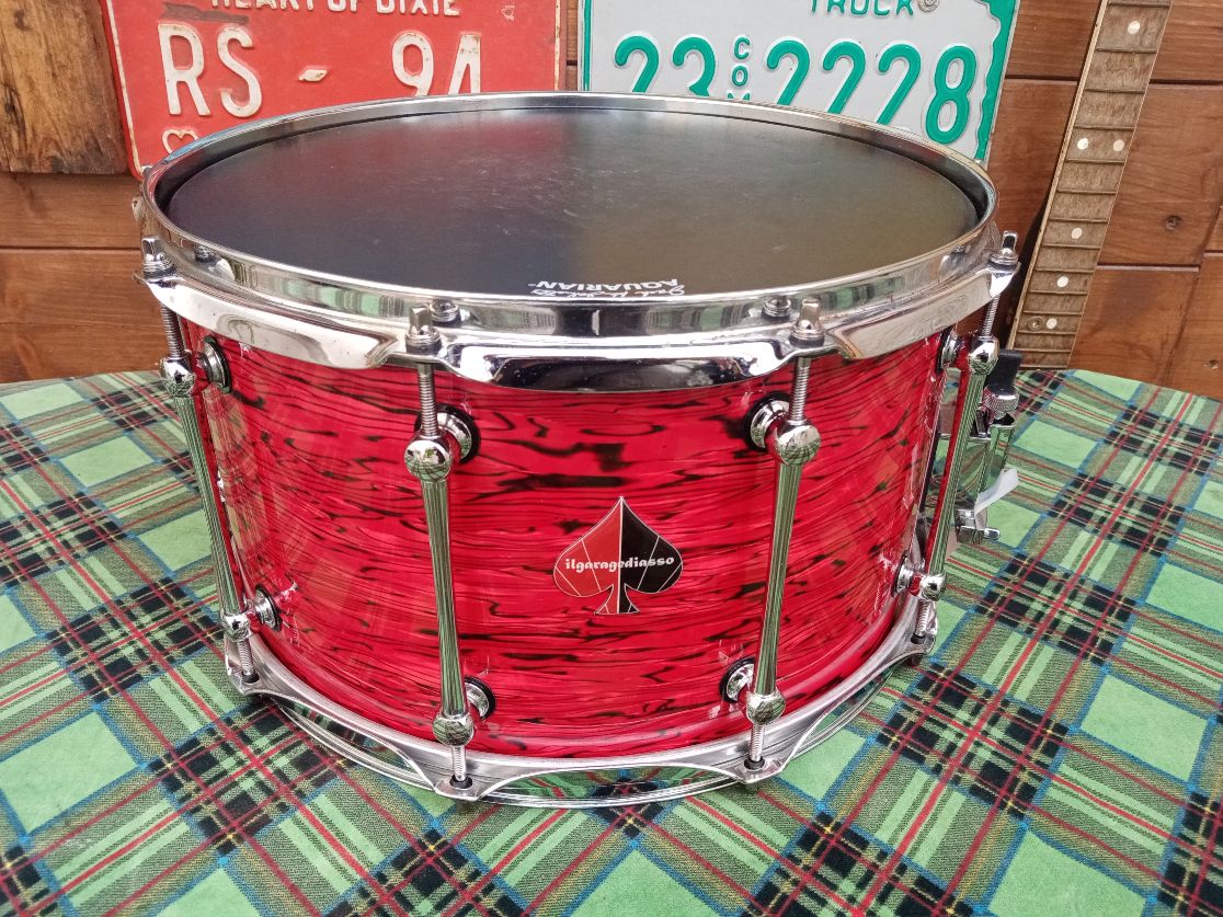 Assemblato con un fusto Keller a 6 strati, dieci Tube Lugs, cerchi a tripla flangia da 2,3 mm., cordiera Phosphor Bronze 20 fili. Finitura Red Strata.