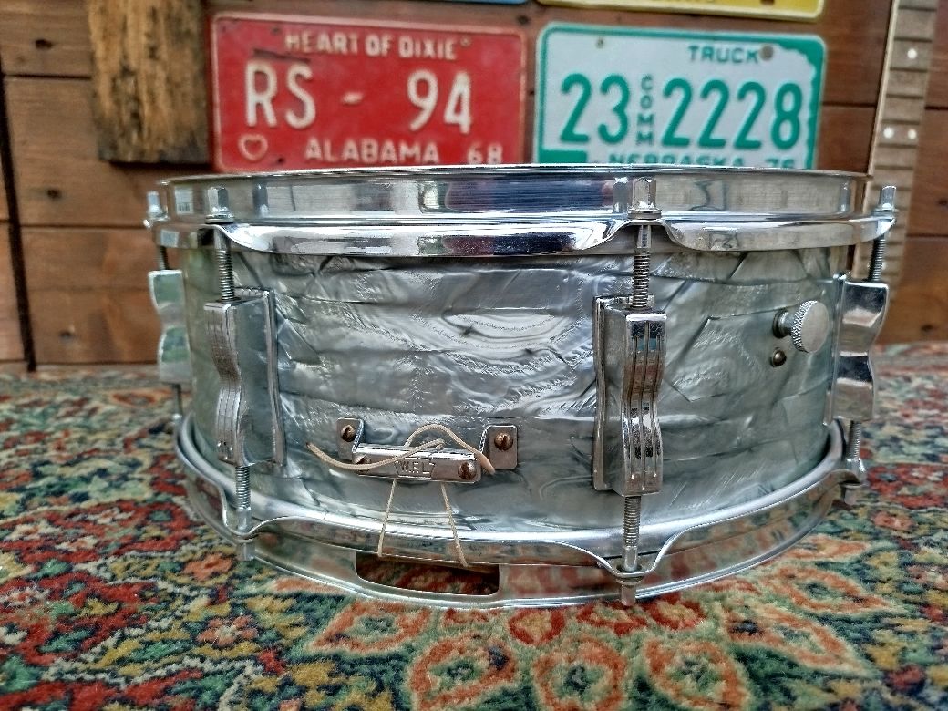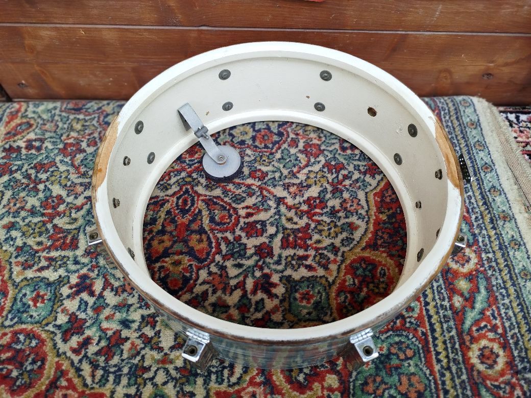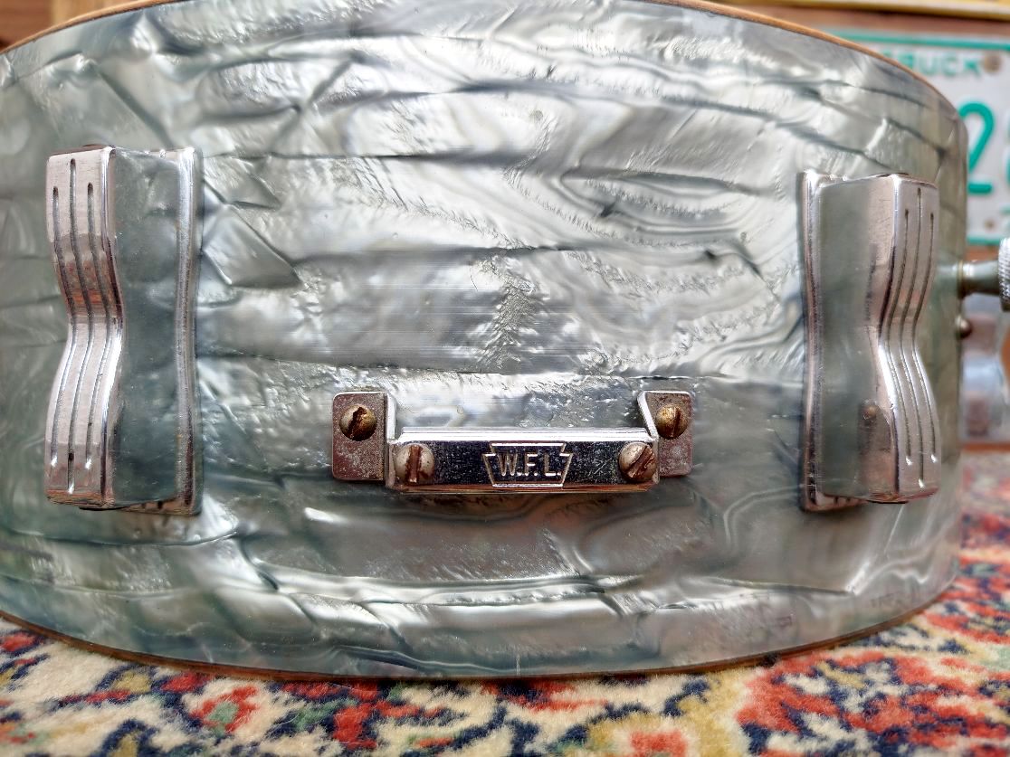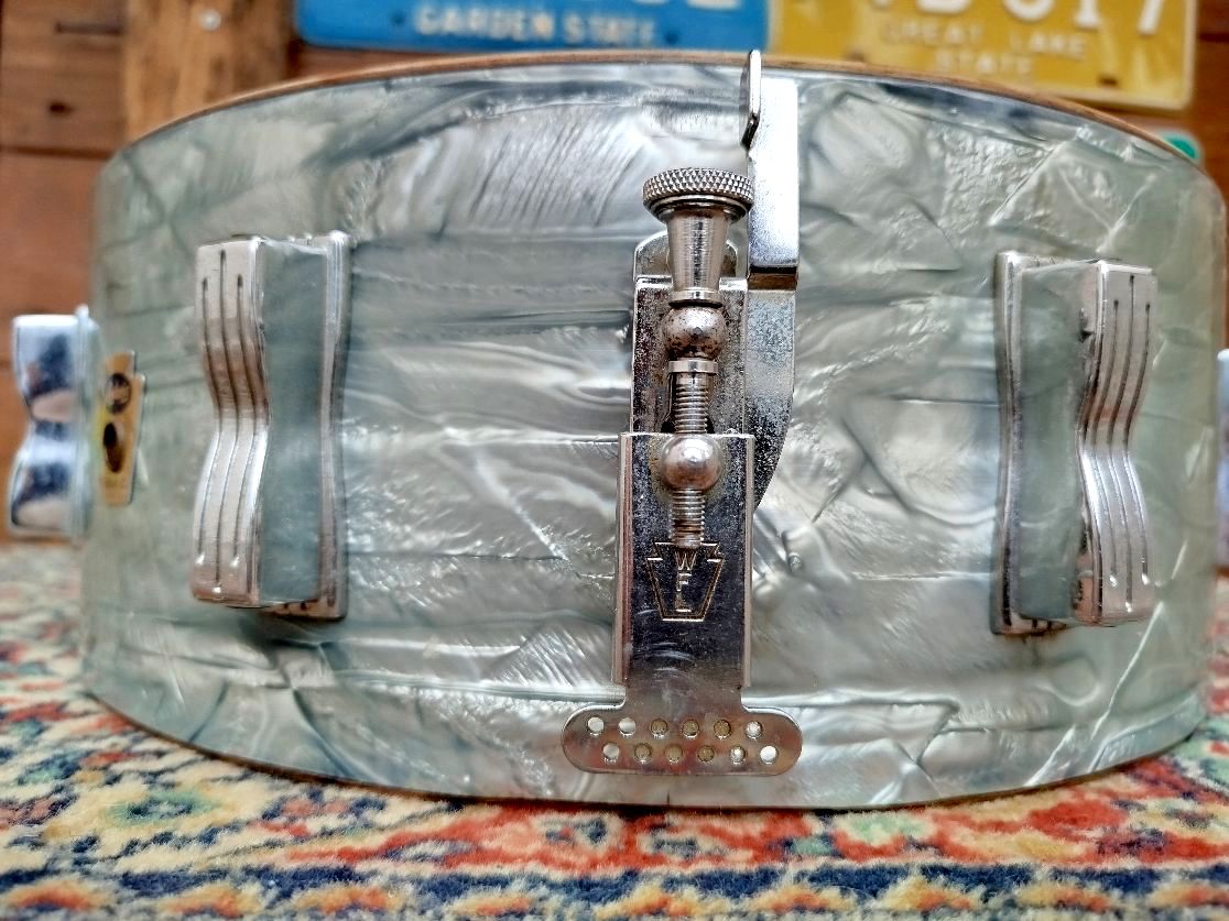 Finitura Sky Blue Pearl, cerchi a tripla flangia chrome over brass, sordina interna P4066, tendi cordiera P83 e butt end marchiati WFL. la cordiera è ancora quella originale con estremità in plastica.