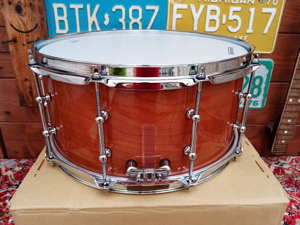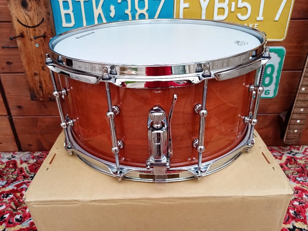 Questo modello ha il fusto in ciliegio a 6 strati per 7,5 mm di spessore, cerchi a tripla flangia, 10 tube lugs, macchinetta tendicordiera P88, cordiera a 18 fili.