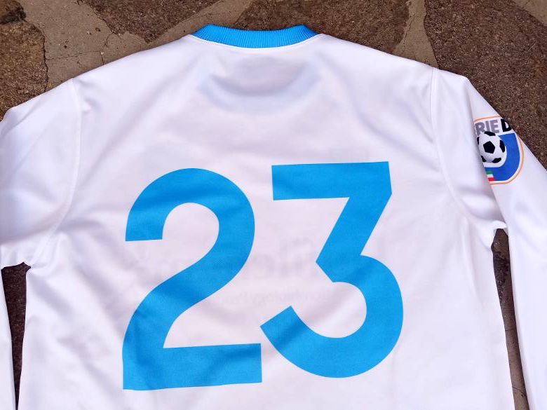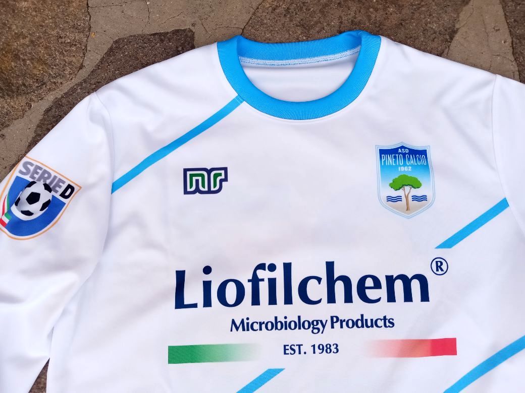 Lo stemma della città e il numero 23 sul retro sono nella trama della maglia, così come lo sponsor Liofilchem, azienda il cui presidente Silvio Brocco (batterista, tra l'altro, quindi attinente con il Garage di Asso) è il patron del Pineto. Sulle spalle troviamo lo stemma della Serie D.