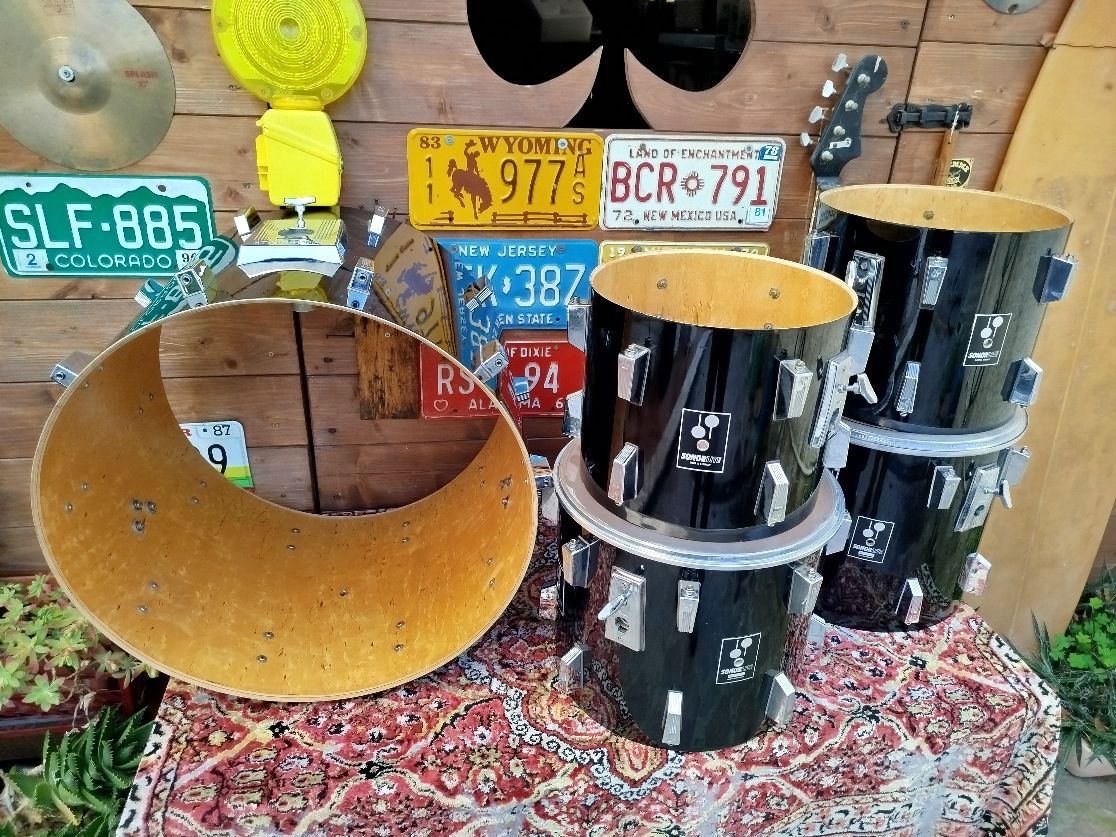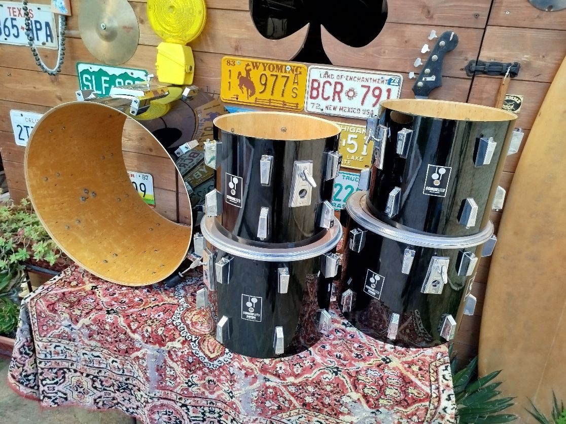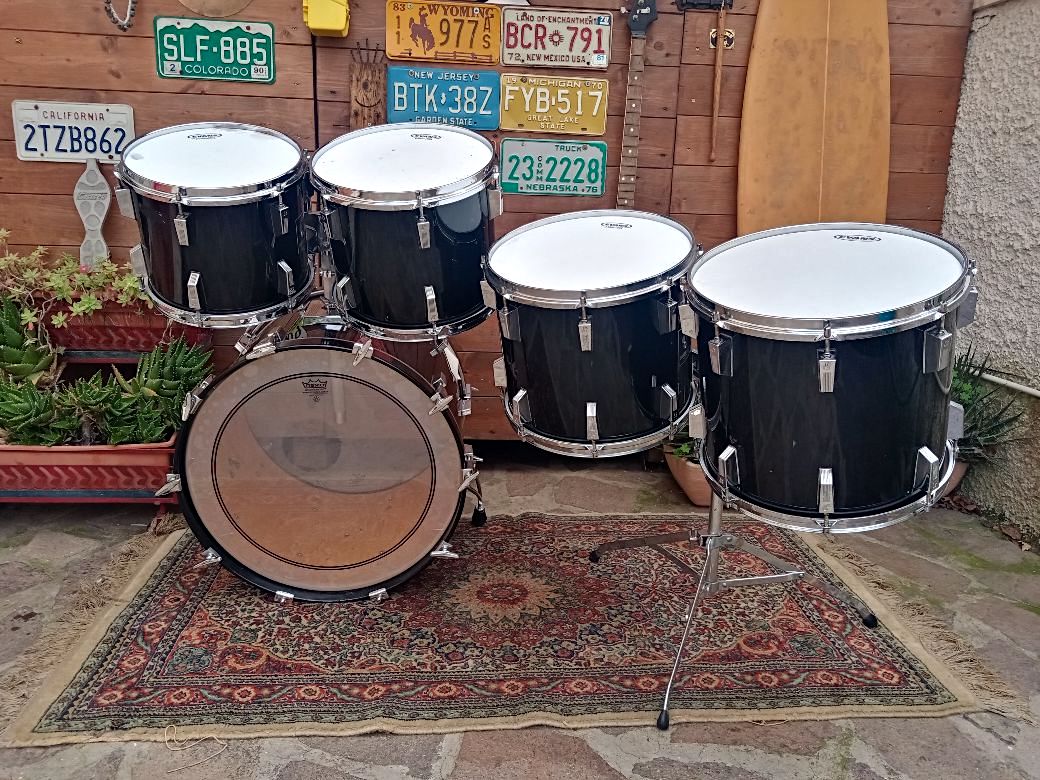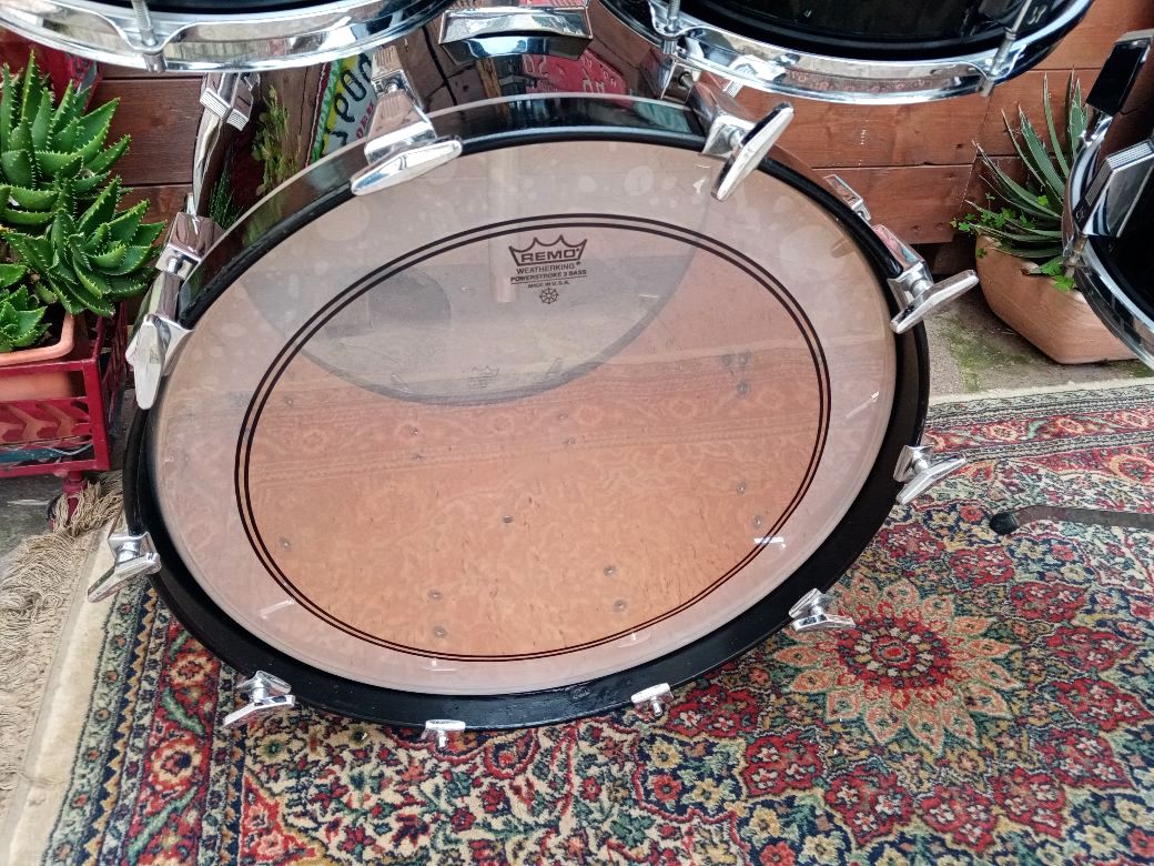 Batteria usata, in condizioni molto buone, qualche piccolo graffio qua e là, ma nessun difetto serio da segnalare. 22”x17”, 12"x10" 13”x11”, 14”x12”, 15”x13”, fusti in betulla scandinava; i tom e il timpano hanno 9 strati e sono spessi 6 mm, la cassa ha 12 strati ed è spessa 9 mm. I bordi, leggermente “undersized”, hanno un angolo a 45°. La finitura era chiamata Graphite Lacquer, praticamente un Piano Black, molto bella ed elegante.