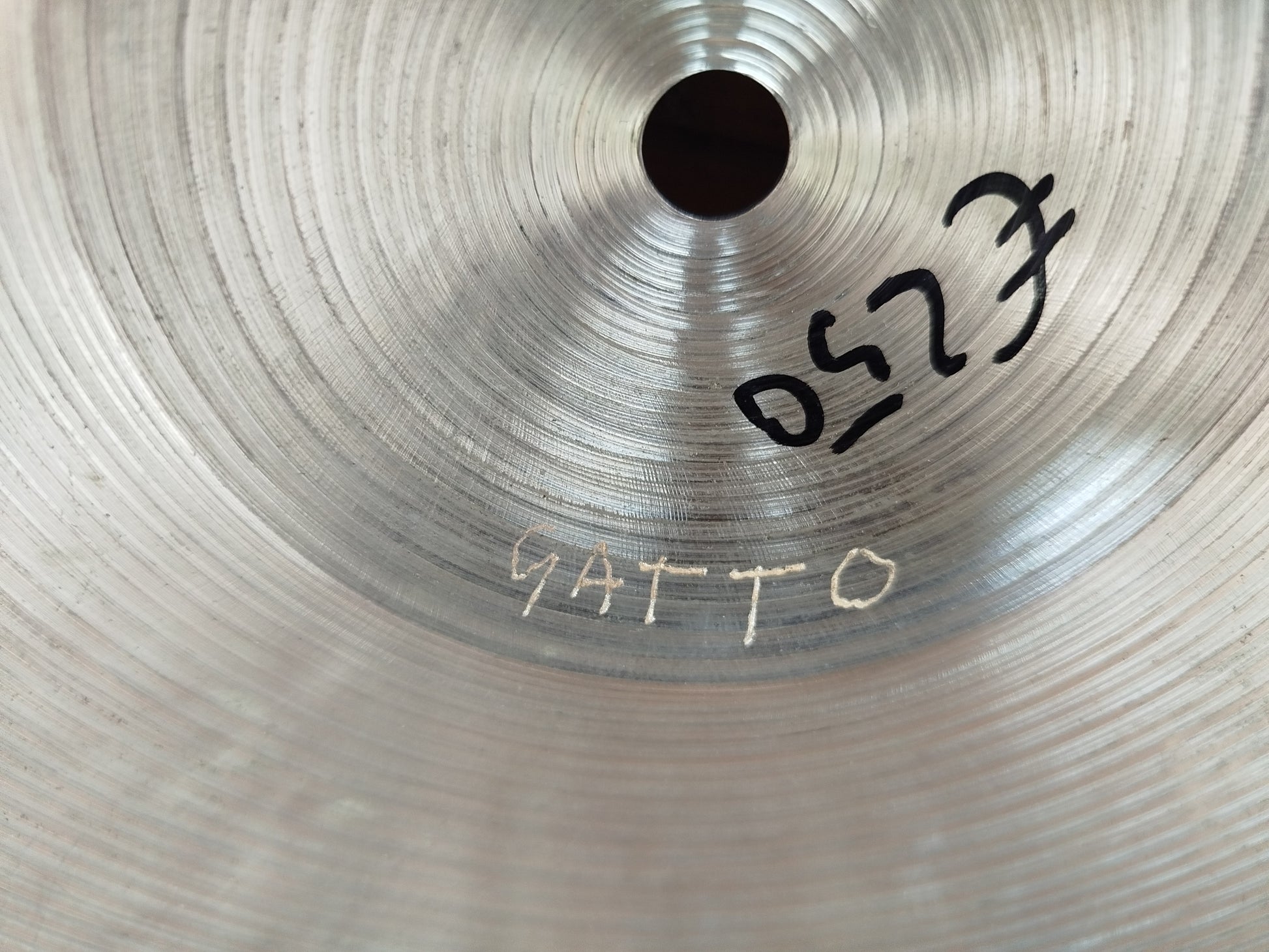 Hi hat 13" usato, in condizioni molto buone, senza difetti; top 756 grammi, bottom 1.539 grammi. Sotto la campana del piatto top notiamo l'incisione del nome del proprietario, Roberto Gatto.
